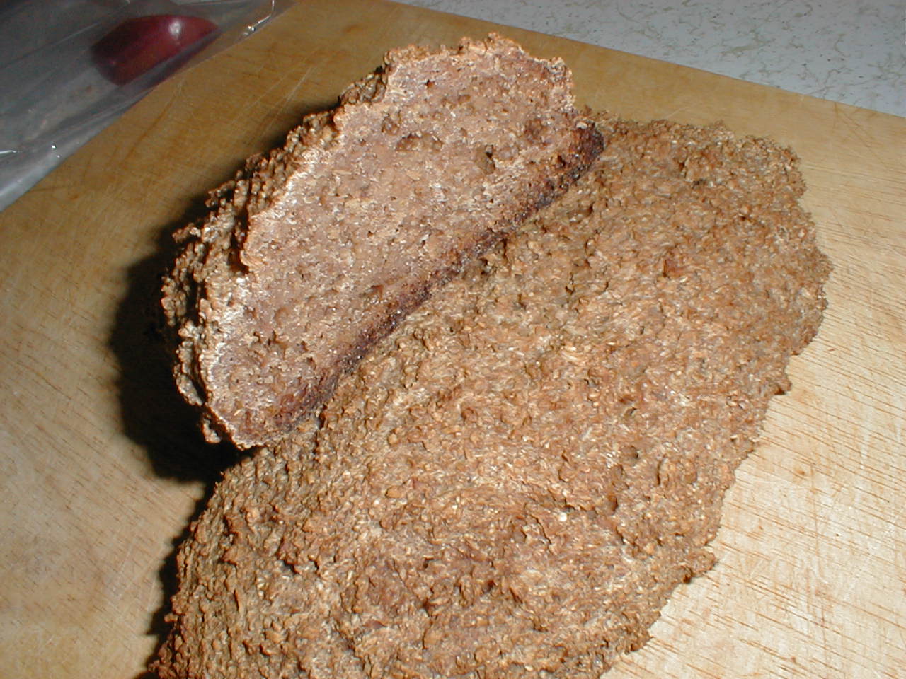 Tuesday evening at 7:30 I took out the dough. It didn't look like the volume had increased, but it had become very moist and sticky, basically no hard rye grains remained. It also smelled and tasted good (grainy & sour). So then, following a method in my Oetker cookbook for a whole grain wheat/rye bread, I formed 2 loaves (so to speak; it was extremely sticky dough), and placed them uncovered on a floured baking stone. I put this on the bottom shelf of the oven, with a pan of water on the top shelf (my own idea), and baked 1/2 hour at 225 degrees. Sort of. As I was describing to Al how I would be cutting back the temp to 180 shortly, I realized I'd forgotten to translate the temperature from Celsius! Good grief! Luckily it had baked in a too-cool oven, not the other way around. So I turned the temp up to 450F, where it was supposed to have been from the start, and left it go another 15 minutes (not sure if that's equivalent, but I figured it might be close). Then I turned it down to 350F (per instructions) for 1-1/4 hours.