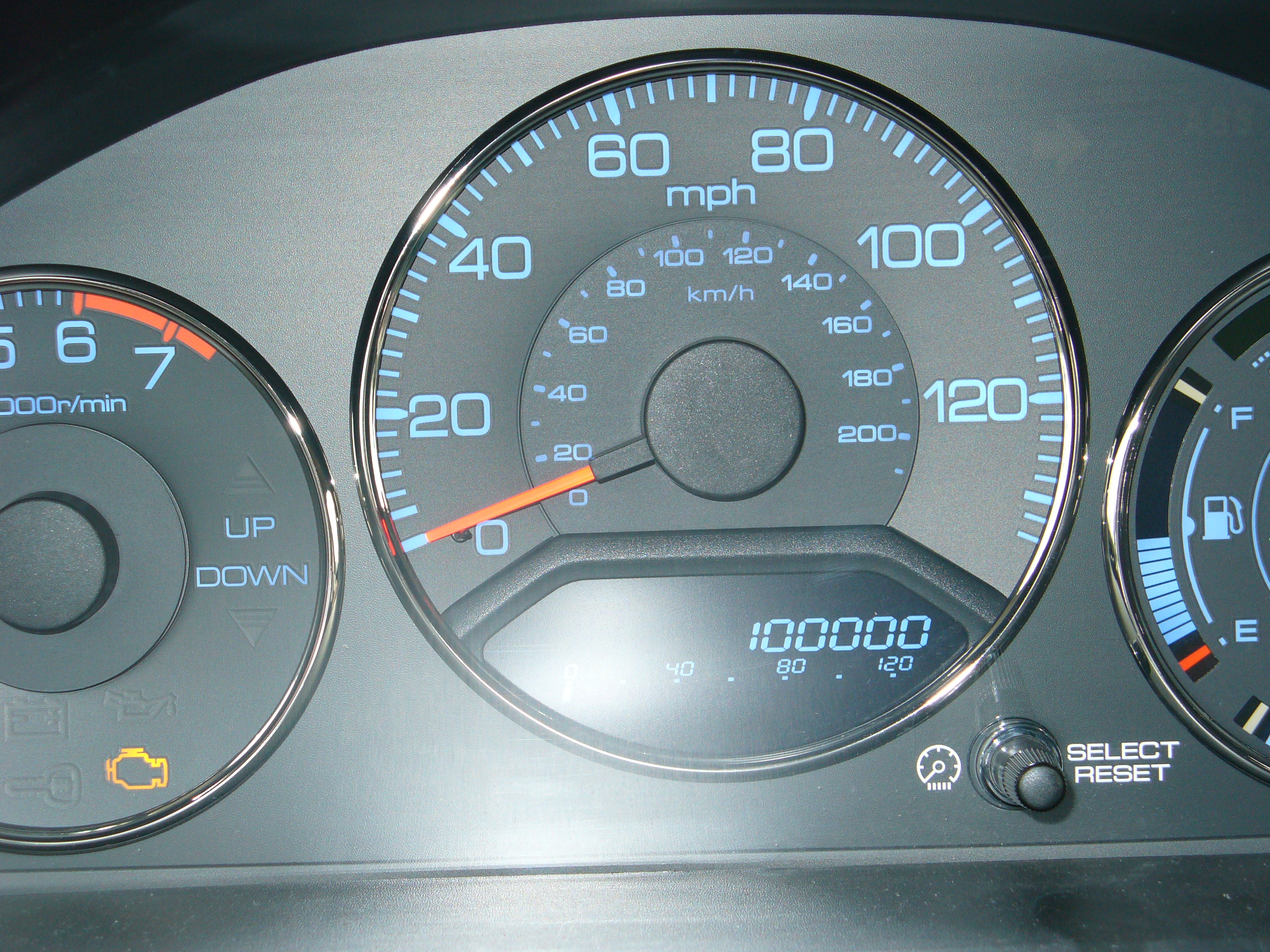 (1) My Civic Hybrid turned 100,000 miles as we turned into our street on our way home from (2) buying our first digital camera. Just in time for me to take a pic of the big event 🙂