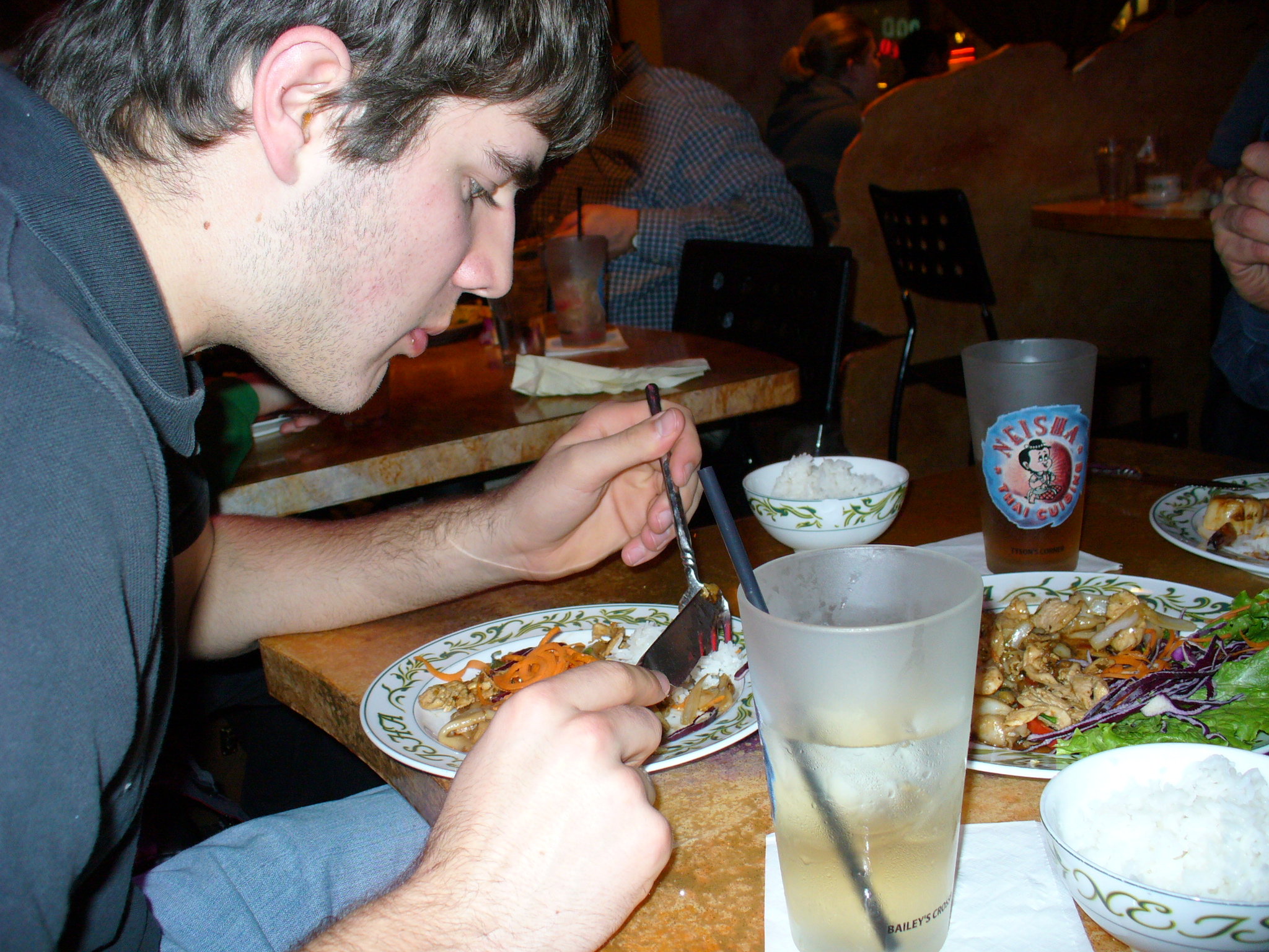 Alex had Kee Mao Kai, which was chicken in basil & chili sauce, with "wide noodles". He was a little surprised to bite into a hot pepper, thinking it was another basil leaf, but he's hardy 🙂
