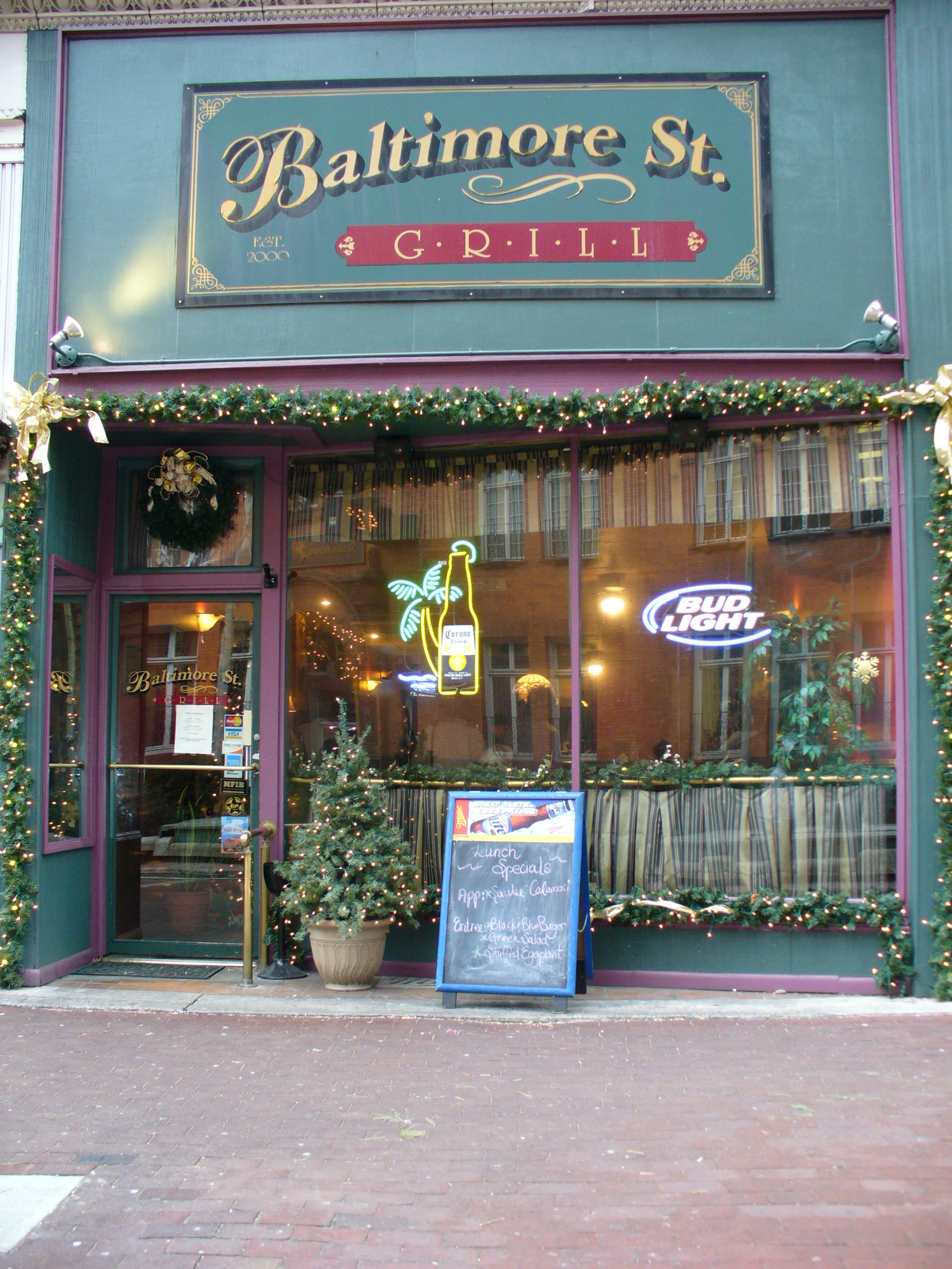 Since we left later than usual, we ended up in Cumberland MD at noon, so we got off there for lunch. Once we figured out how to actually get to the downtown area, it turned out there's a very nice pedestrian city center (along with an inordinate number of banks). We parked in the Center City Parking Garage (for 50 cents an hour), and walked to the Baltimore Street Grill.