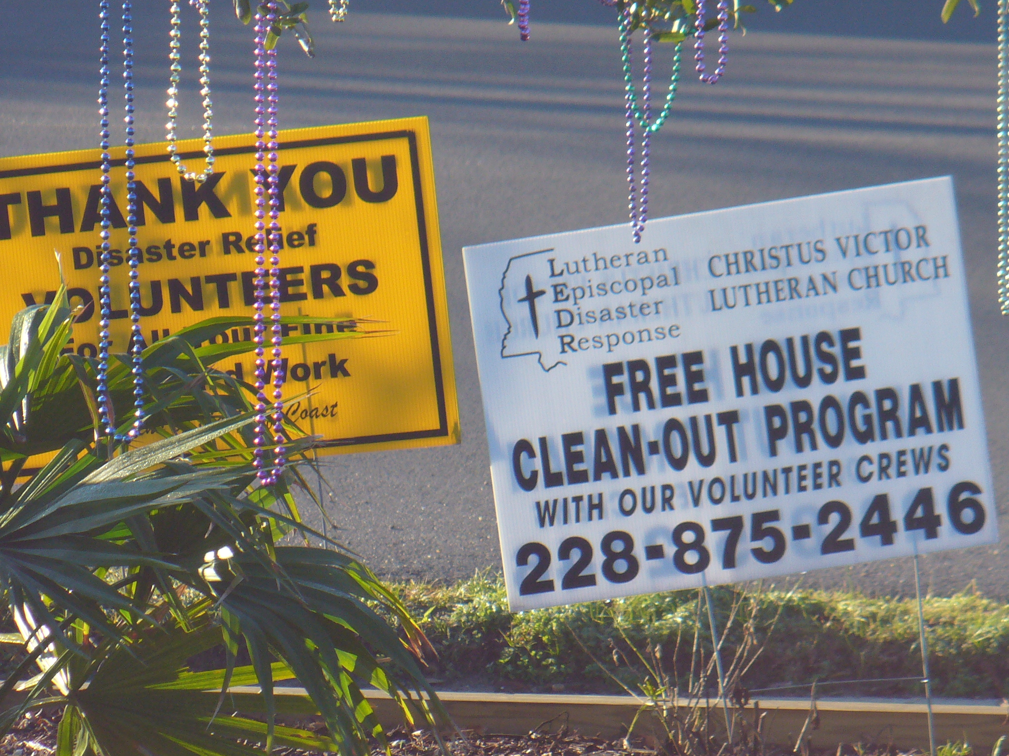 Christus Victor Lutheran Church is a church on Rt 90 in Ocean Springs. When Katrina hit, the church staff was at the church, and waited out the storm. Only afterward did they realize how bad it had really been. People from the community started coming to the church for help and a place to stay, because this church had always been known as a place of help and refuge in the area. There was no power or telephone service, but one of the staff members' DSL connection was still working somehow (the only one they knew of, and luckily right near the church). So for 15 minutes every 4 hours, he would run his generator to power his modem, and they would send emails out to call for food and help. Meanwhile, the church had become a de facto Red Cross shelter, and in fact this was one of the first times the Red Cross had used a private structure as a shelter. They were able to house several hundred people in the church.