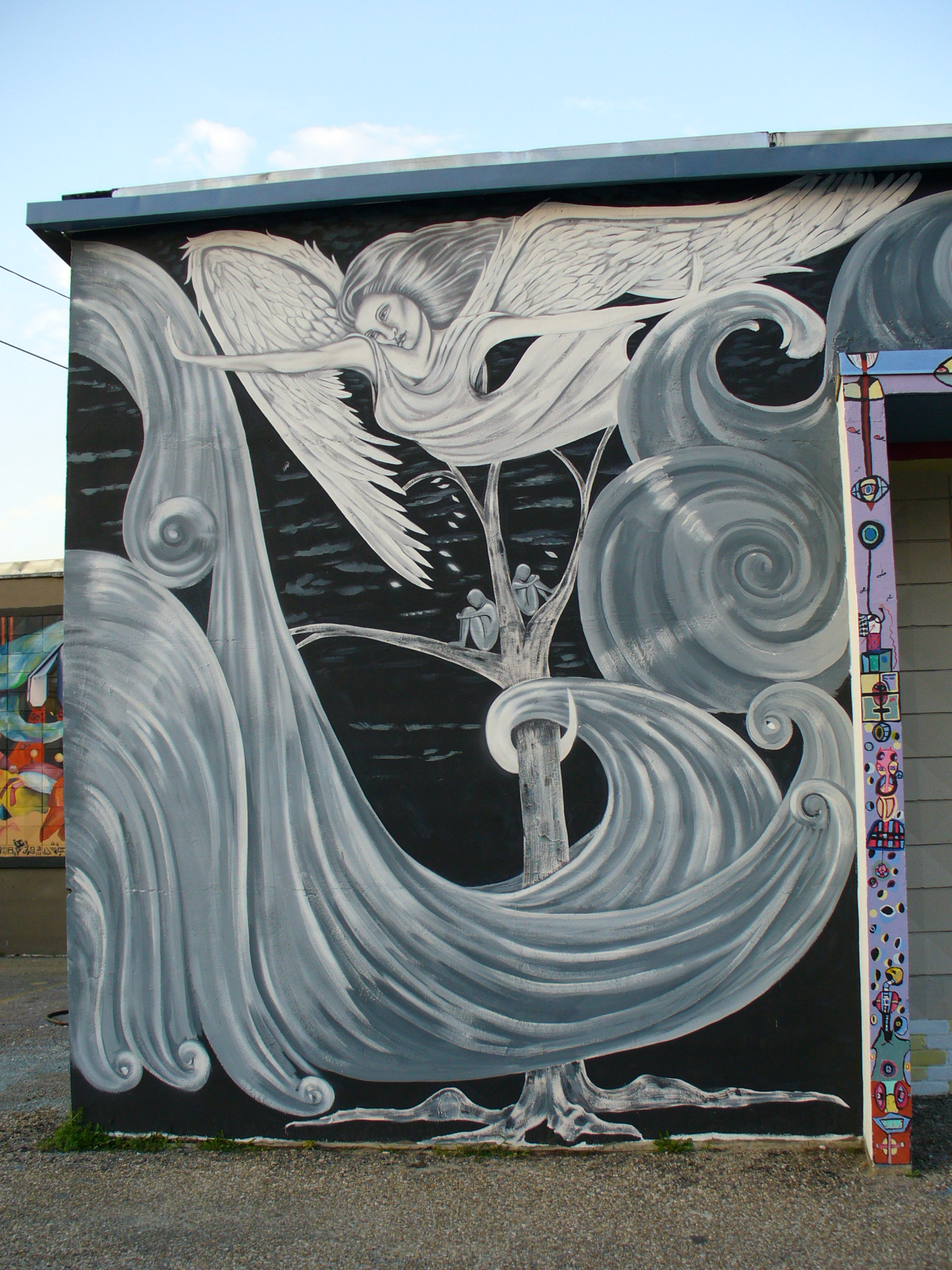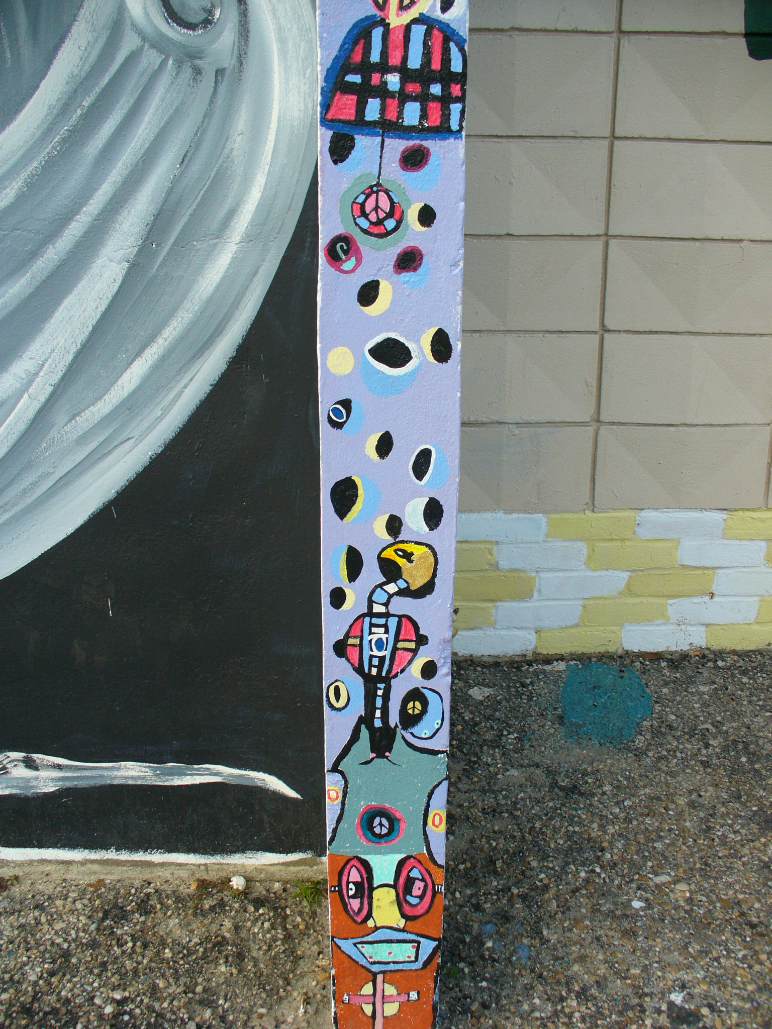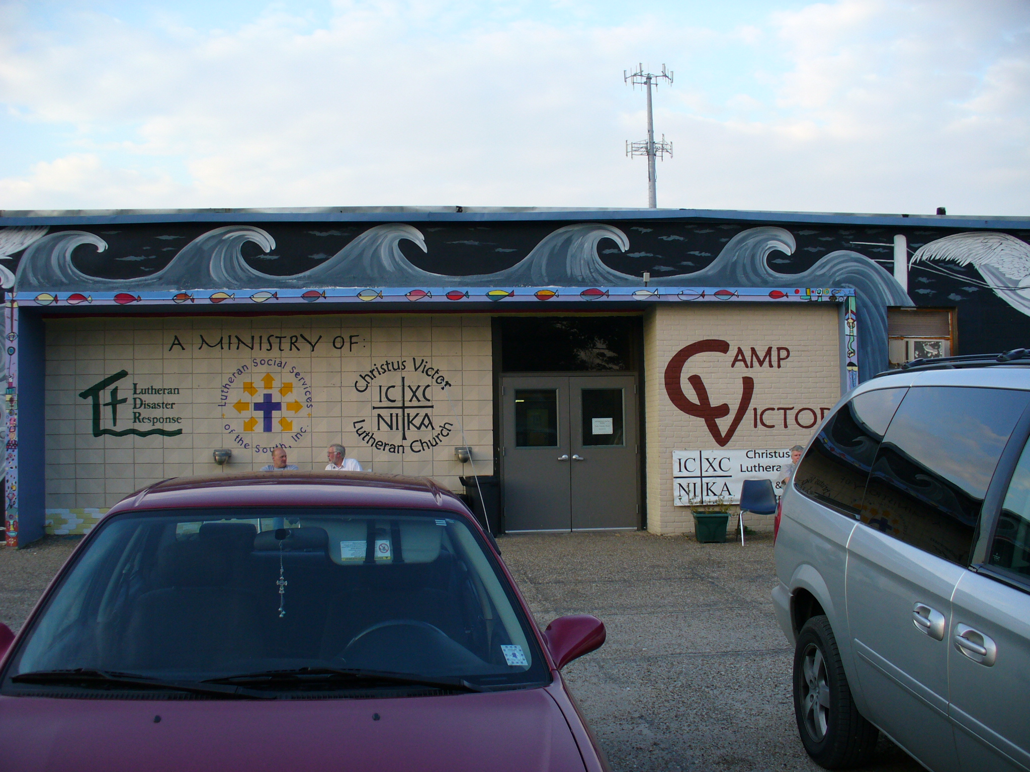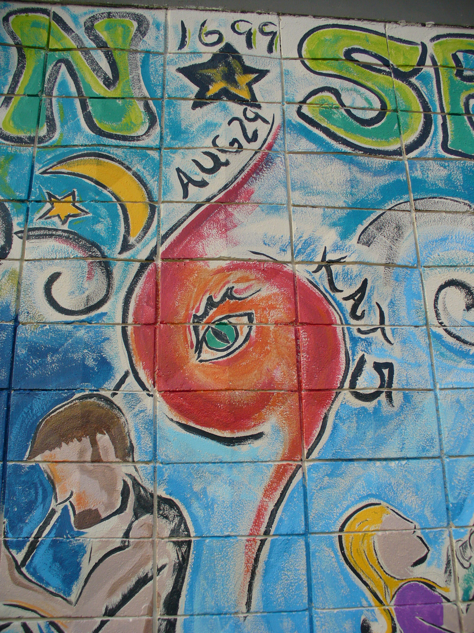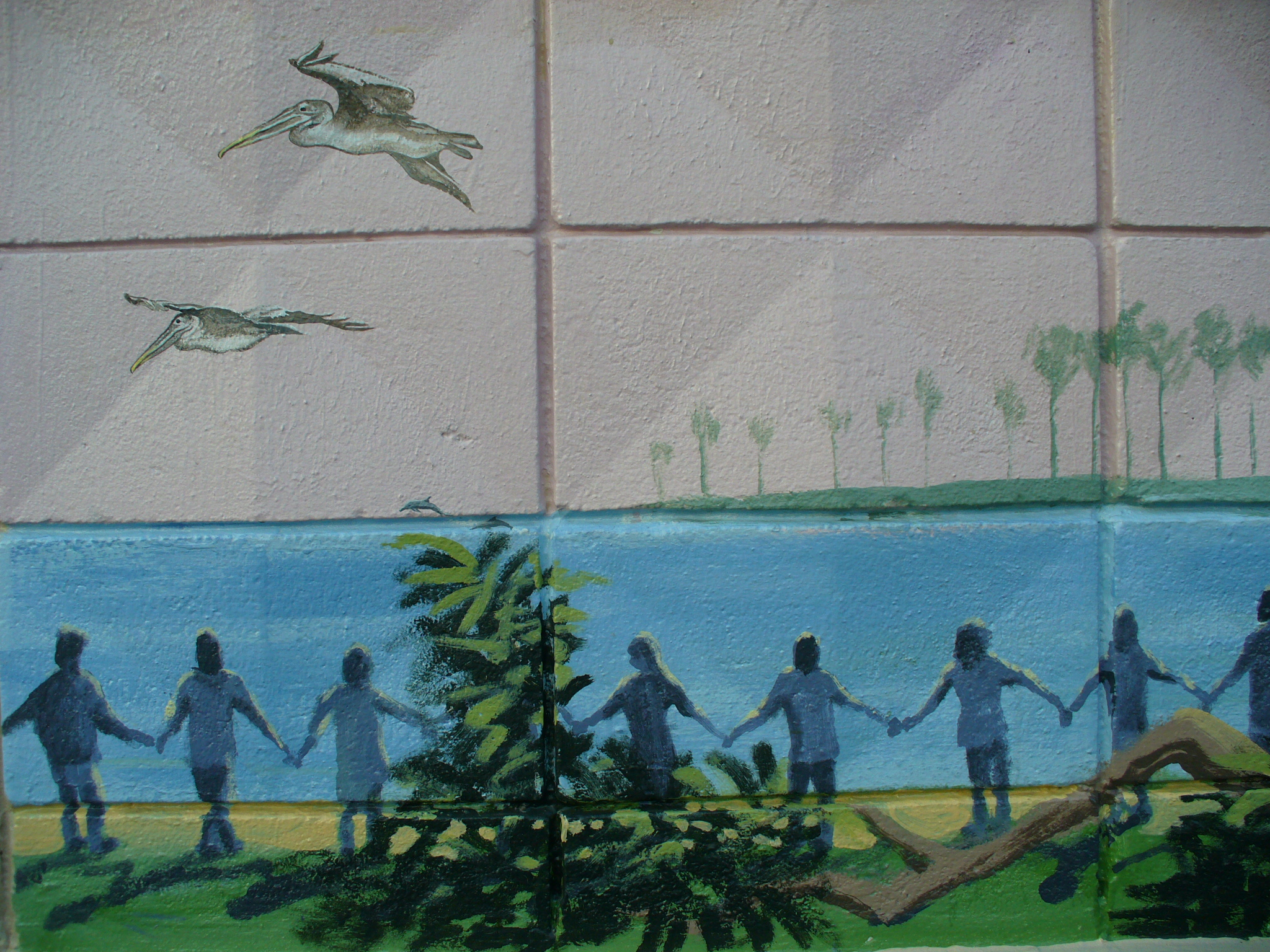 Now, the exterior artwork, which is really wonderful! Ocean Springs is in large part an artist's community, and several local artists were commissioned to decorate the outside of the block wall building housing Camp Victor. It's truly a beautiful landmark building in the town now!