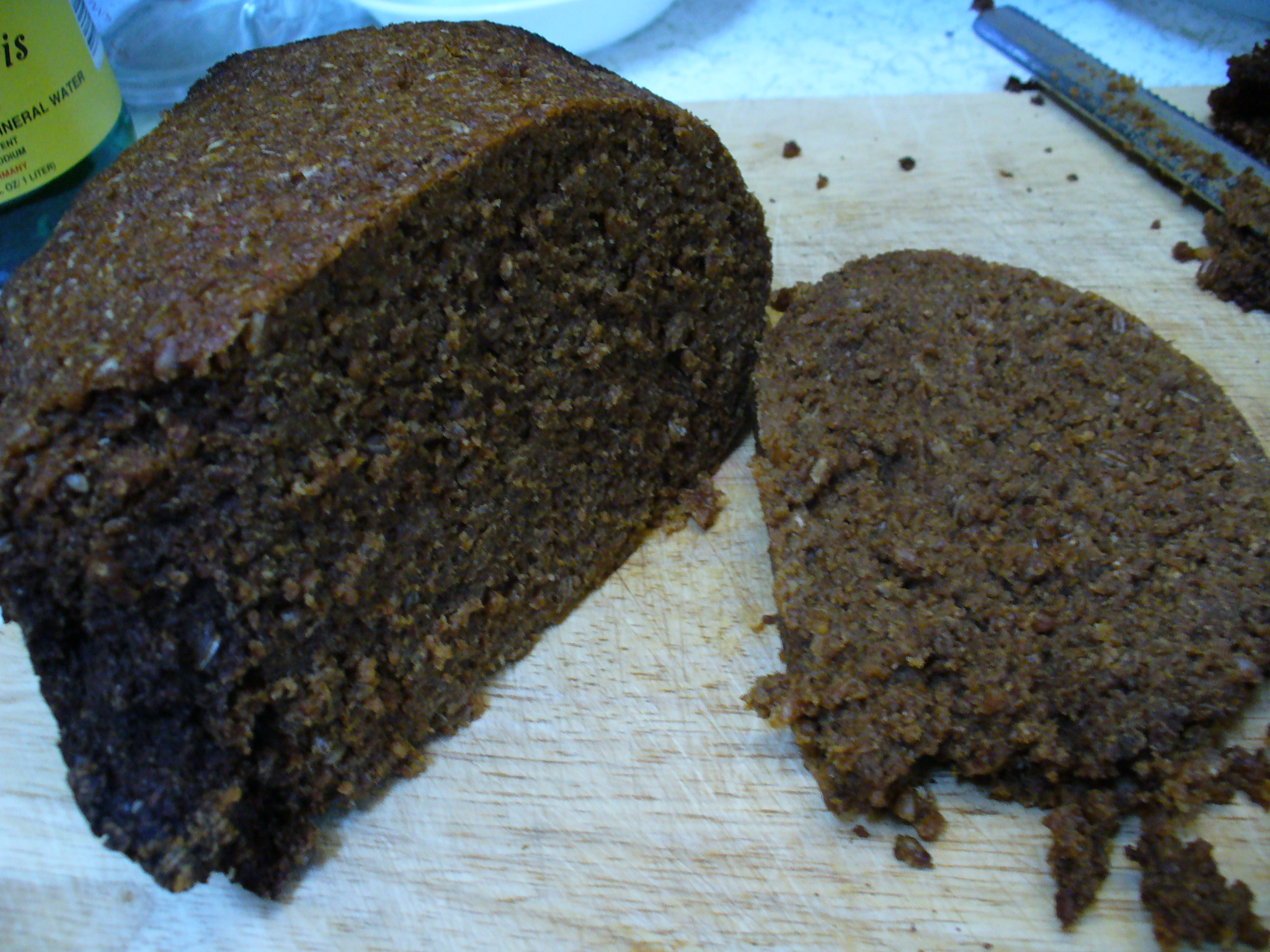 As some of you may recall, I've been trying for, oh, about a year now to make a real loaf of pumpernickel – not what passes for it in the store, but the kind that is sweet/sour, moist, and cooks for hours till the Maillard Reaction turns it black. Back in May, I made some that was pretty close, but the recipe still called for some yeast and some molasses, whereas the traditional pumpernickel I'd gotten from Germany had only rye meal, sourdough, and malted barley. And I knew from my research that the traditional pumpernickel is cooked in a steamy oven for many many hours to allow the reaction to take place. But the couple times I tried that, I got a result that was way too hard to cut into.