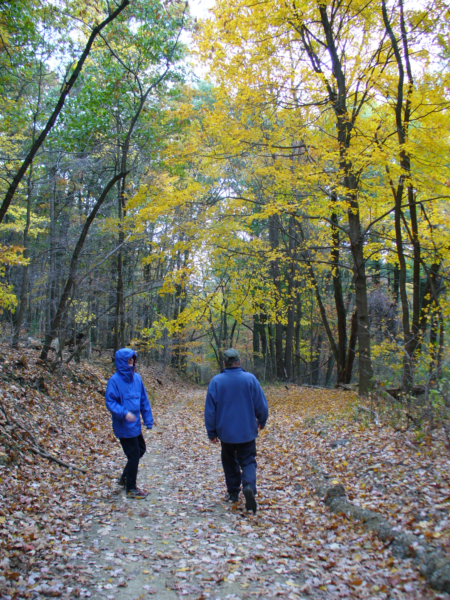 She said she was pretty sure the trailhead was near the pool, but the website says to park down near the lake spillway, so we thought we’d better do what the website says, since we couldn’t tell by the large-scale map which direction the trail took through the park. So we met at the lakeshore parking area around 1:30; by the time we got there, L had already scouted out where the trailhead was. Hint to future hikers: I suppose there must be some reason for the trail to head across a little causeway, then double back through the woods around a pond so that you re-cross the road right near your car after hiking for 10 minutes, but I can’t think what it might be. You’re better off to cross Babcock Rd at the Pearce Mill intersection, and begin to follow the yellow blazes from there — heading down the bank of the spillway.