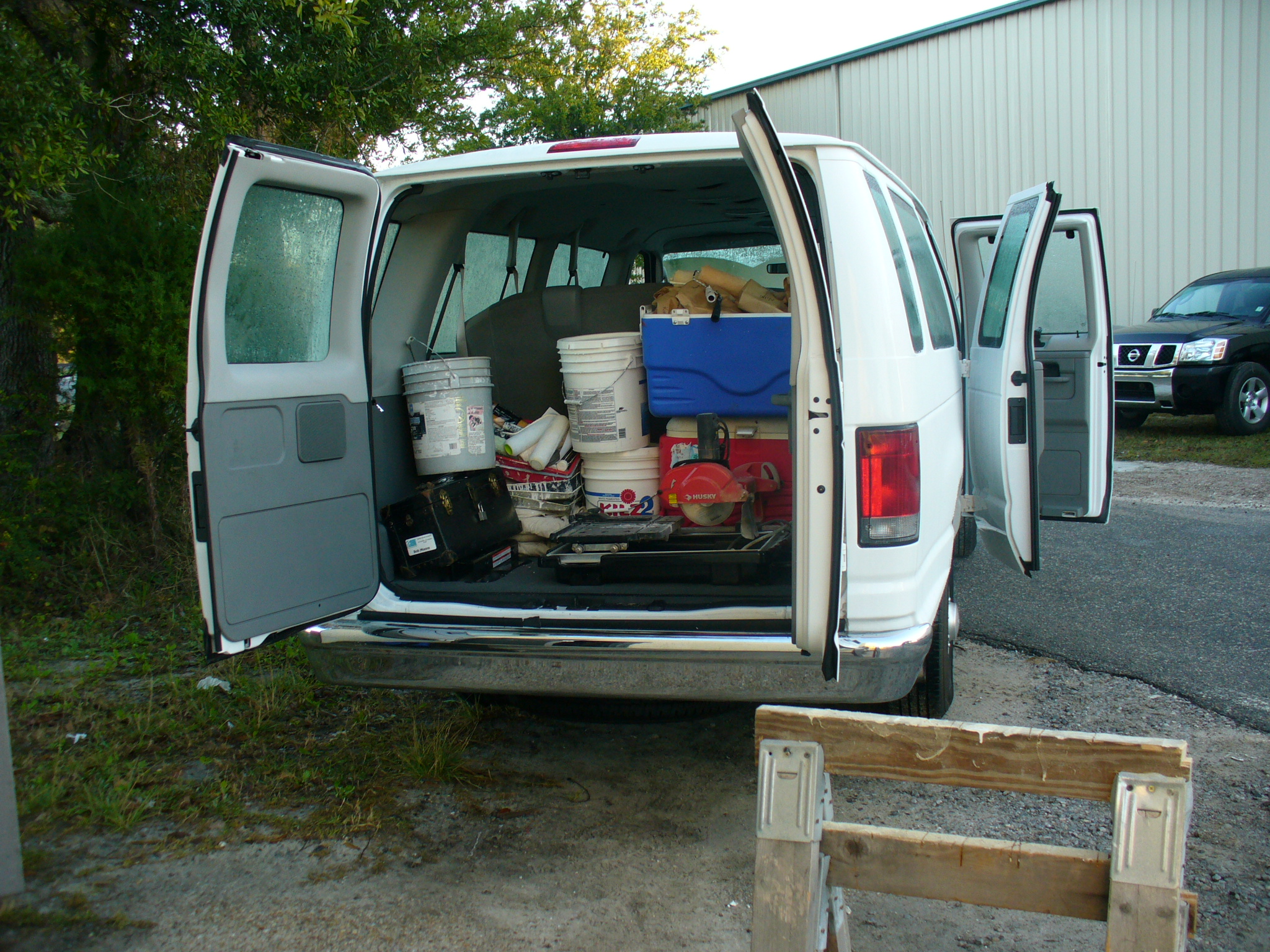 Then after going back to the dorm to finish changing into work clothes (i.e. boots rather than sneakers), we all made our way to the warehouse at the back of the camp to select our tools and supplies. It was all rearranged since last year, but the aisles were well labelled, so it didn't take us long to find what we needed… exterior primer for the siding, interior primer for the walls that weren't done yet, a tile cutter because the paper said the floor tile was to arrive today, paint brushes, rollers, trays, drywalling tools and tape. All tools and supplies have to be checked out in the warehouse office, and then we loaded everything into one of the two 15-passenger vans that the synod rented for the week. Then we loaded into the van, too, though we could only fit 12 since we took out the back seat to fit in the gear. So the rest of our group went in the other van, which also was carrying a small crew of 4 to another job out in the same general direction. There was a GPS in each van, so we used that to get us to the jobsite ("Turn left. Turn left." OK – OK)