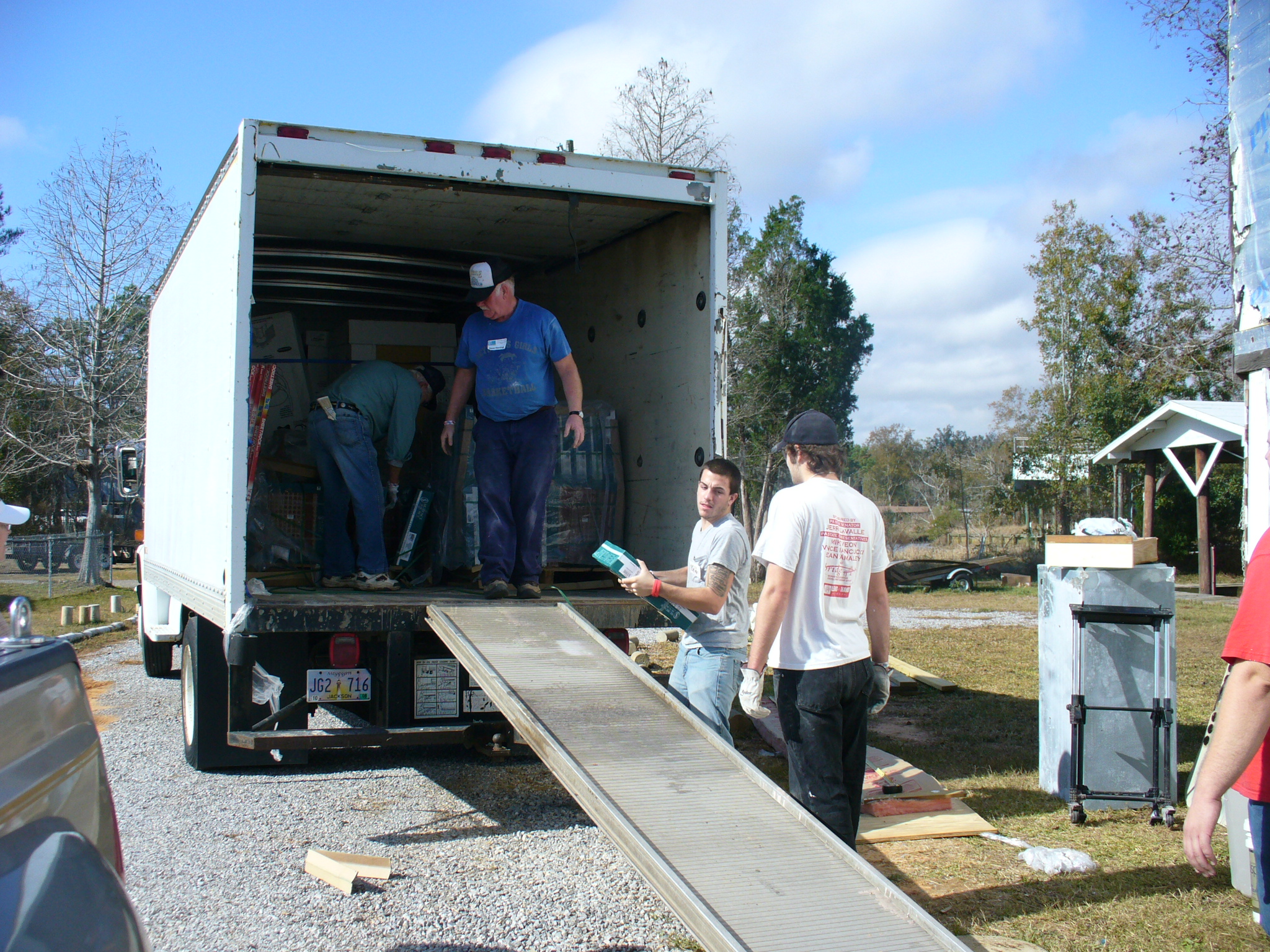 Dinner back at camp was a variety of quiches, which were really pretty good. I had Mexican, with salsa & sour cream on top, mmm. After dinner, we met Gregg from PA, and learned (because we asked) about the complete history of the Moravian Church, which we had known nothing about. It was very interesting – they're a relatively very small denomination, but disaster relief is apparently a major focus for them. We attended the little service at 7:00 (really just some singing with guitars), and then dispersed to get showers, etc. They played the BCS Champsionship game on the projector at 8:00 – LSU was pretty much the home team, though there were plenty of Yankees rooting for OSU, for what good it did… I found that I could access the wireless network from the dining hall (which I couldn't last year), so I sat up and checked emails and posted about the bus trip.
