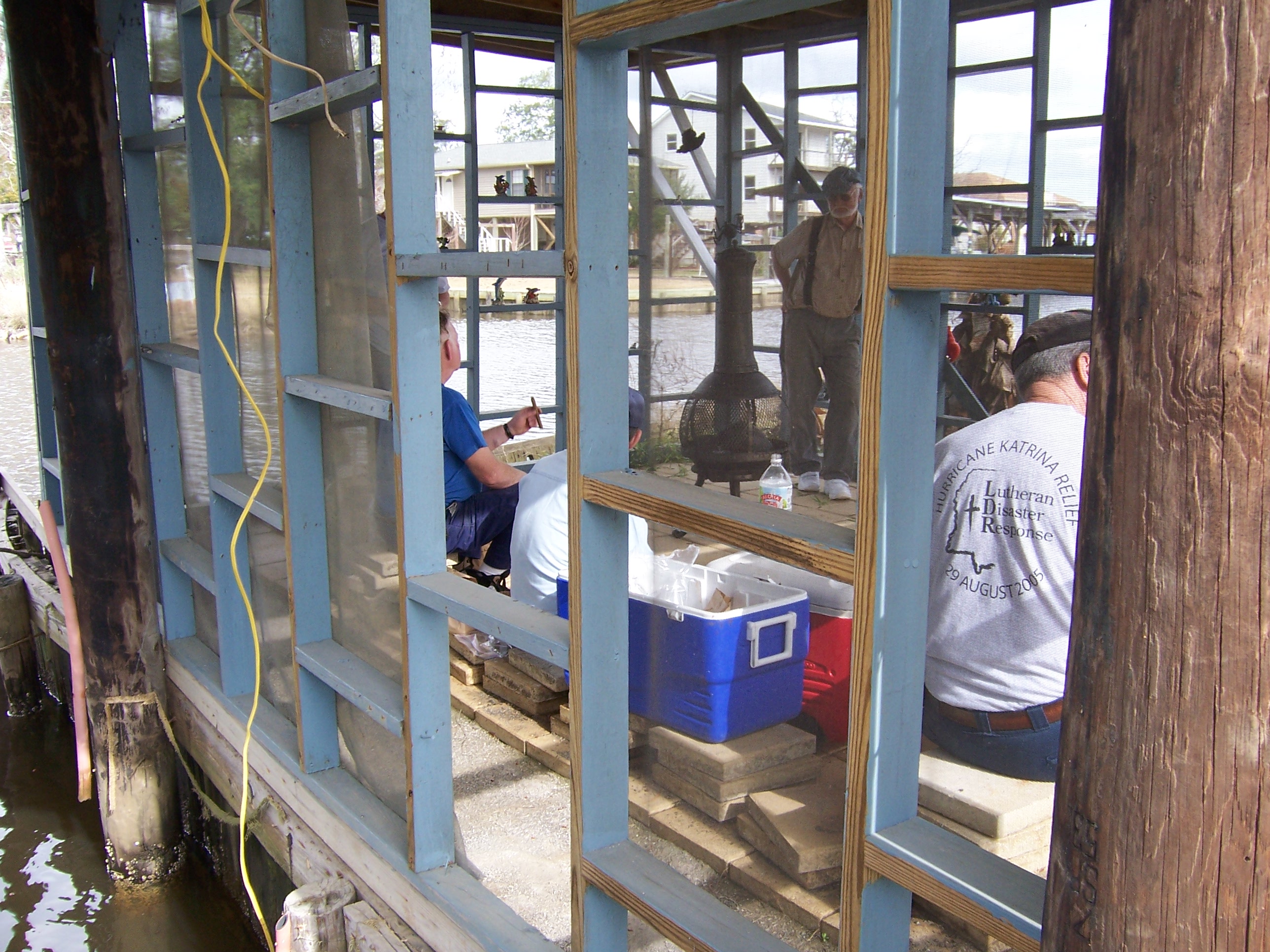 Lunchtime… there's a cool little boathouse where we stored our coolers and ate lunch. Half of it was a dock, with a sling and winch system for lifting a boat out of the water, though we didn't hear whether she had a boat and lost it, or what. Attached to it was a screened-in patio with a tile floor and some tables & chairs, and one of those outdoor fireplace things. The screens needed some work, but otherwise it was a really nice little outdoor living space. From what we could gather, these structures had been damaged by the storm, but were rebuilt by a crew of Mexicans (perhaps the group that initially fixed the house?), until they were frightened away by alligators, which Mister Bob seemed to find hilarious.