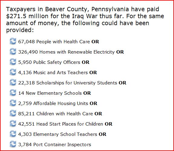 Here's what the site calculated that we in our little county in southwestern PA could have done with our share of what's been spent so far on the Iraq invasion/occupation: