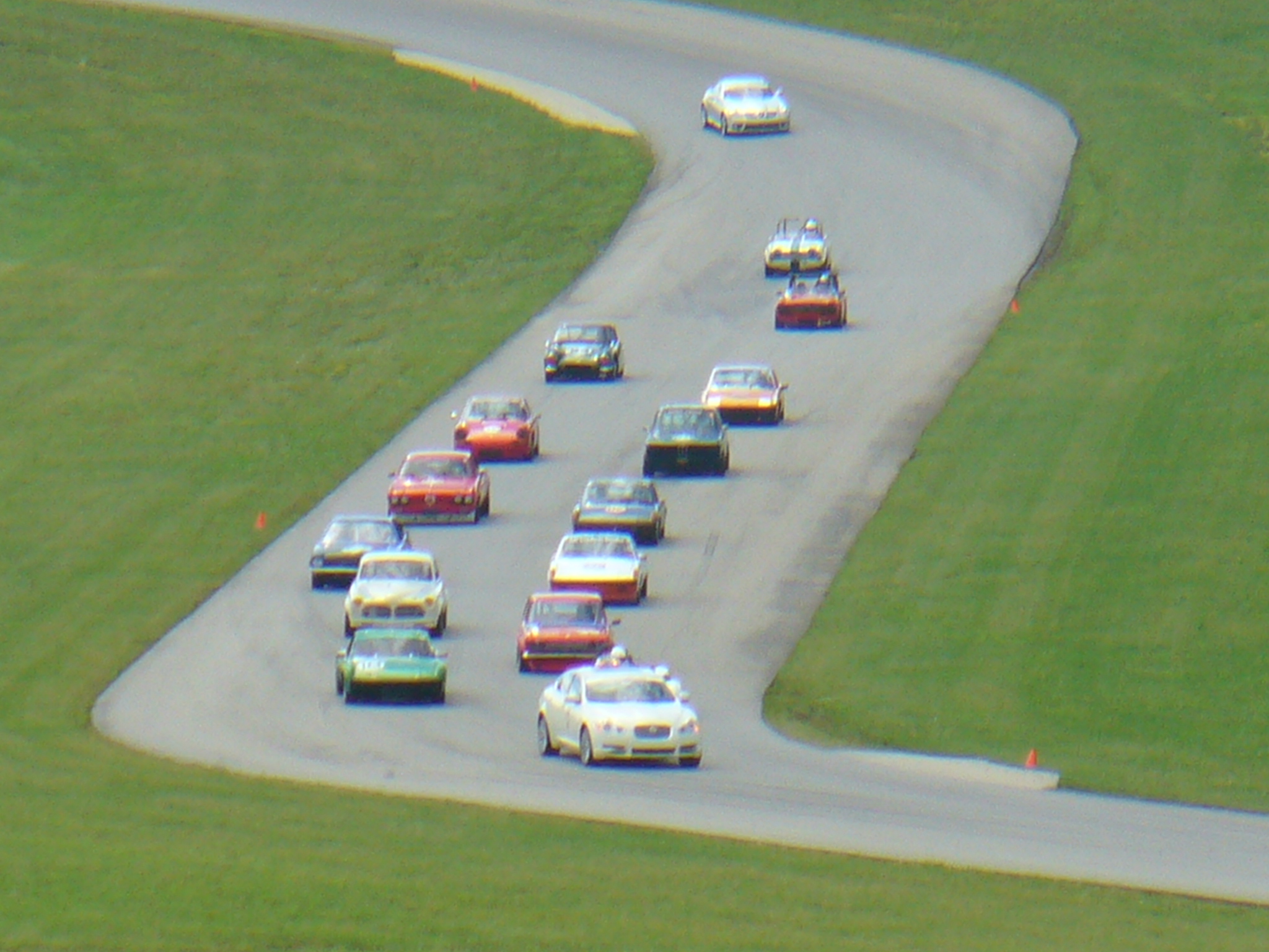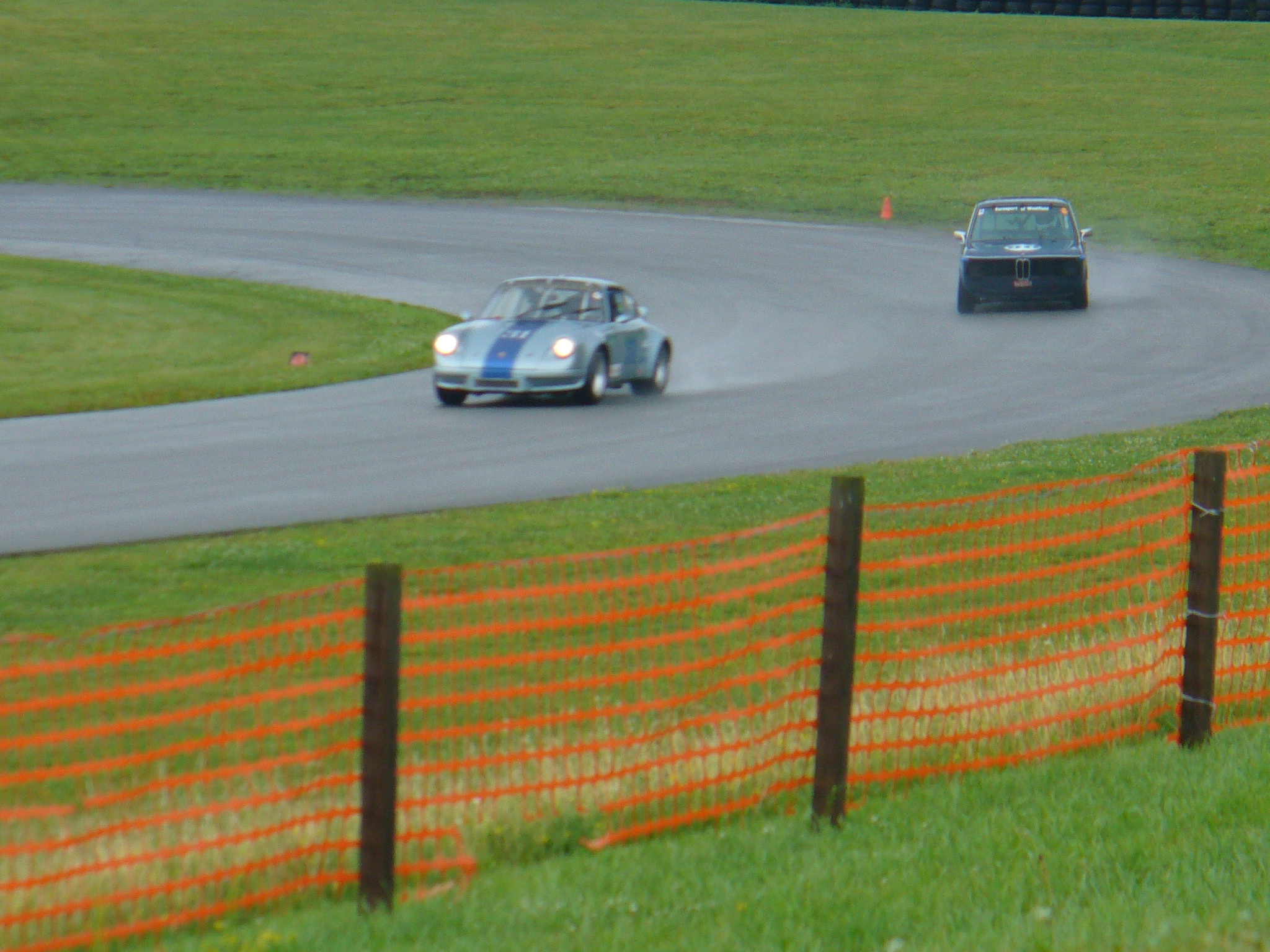 Group 3: BMW / Porsche Challenge (just a race between members of the local BMW and Porsche clubs, all years and models). There was another downpour during this race, and the lead car spun out around that bend you see there; the driver got an award at the end of the day for "saving his car while doing multiple donuts" [and another car narrowly missed him].