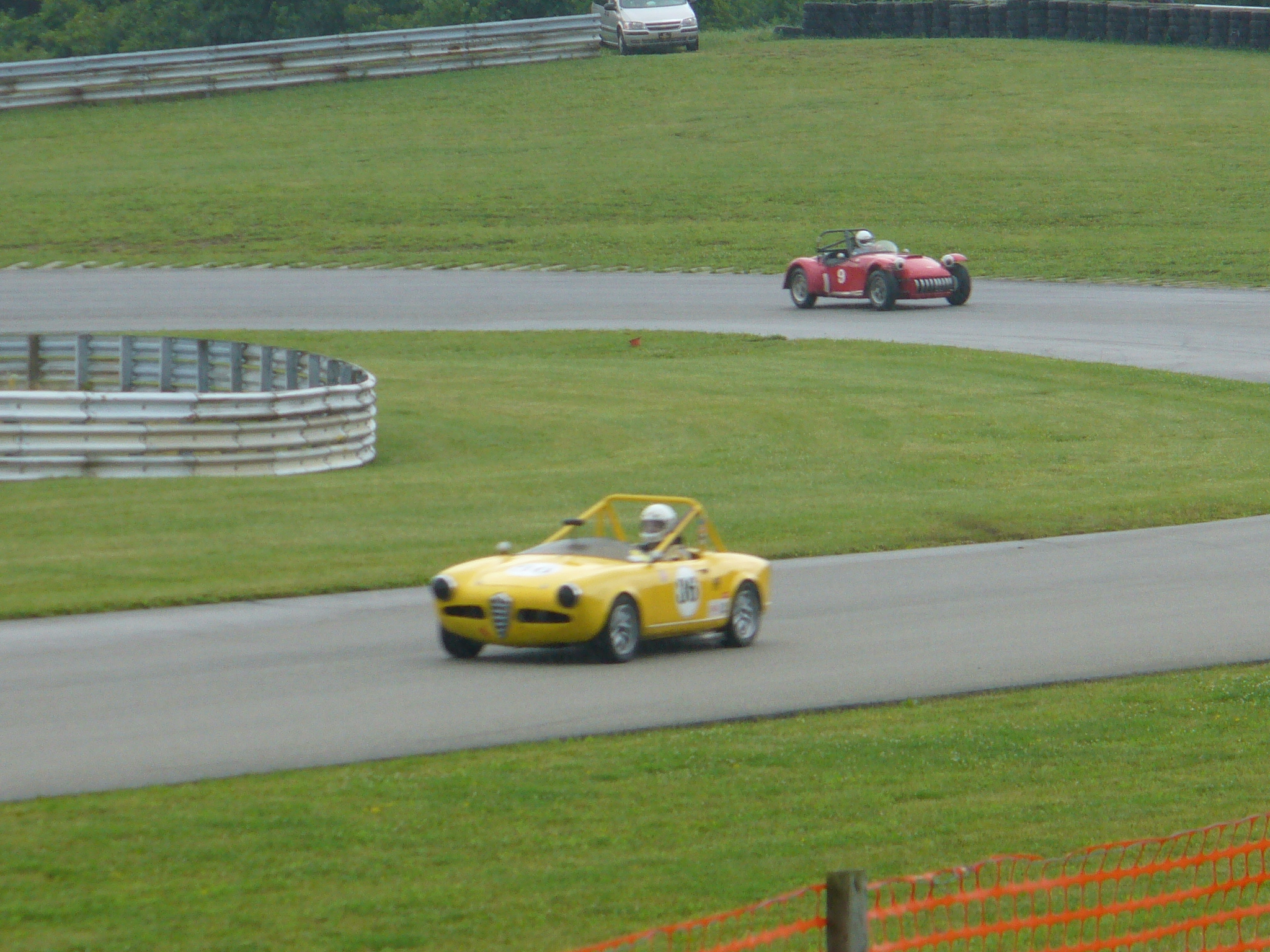 Group 1: muscle cars basically (Mustangs, Corvettes, Cobras, Porsches) – though only 6 of the 16 entrants actually went on to the track, probably because it was so wet. You can see the spray coming up from their tires.