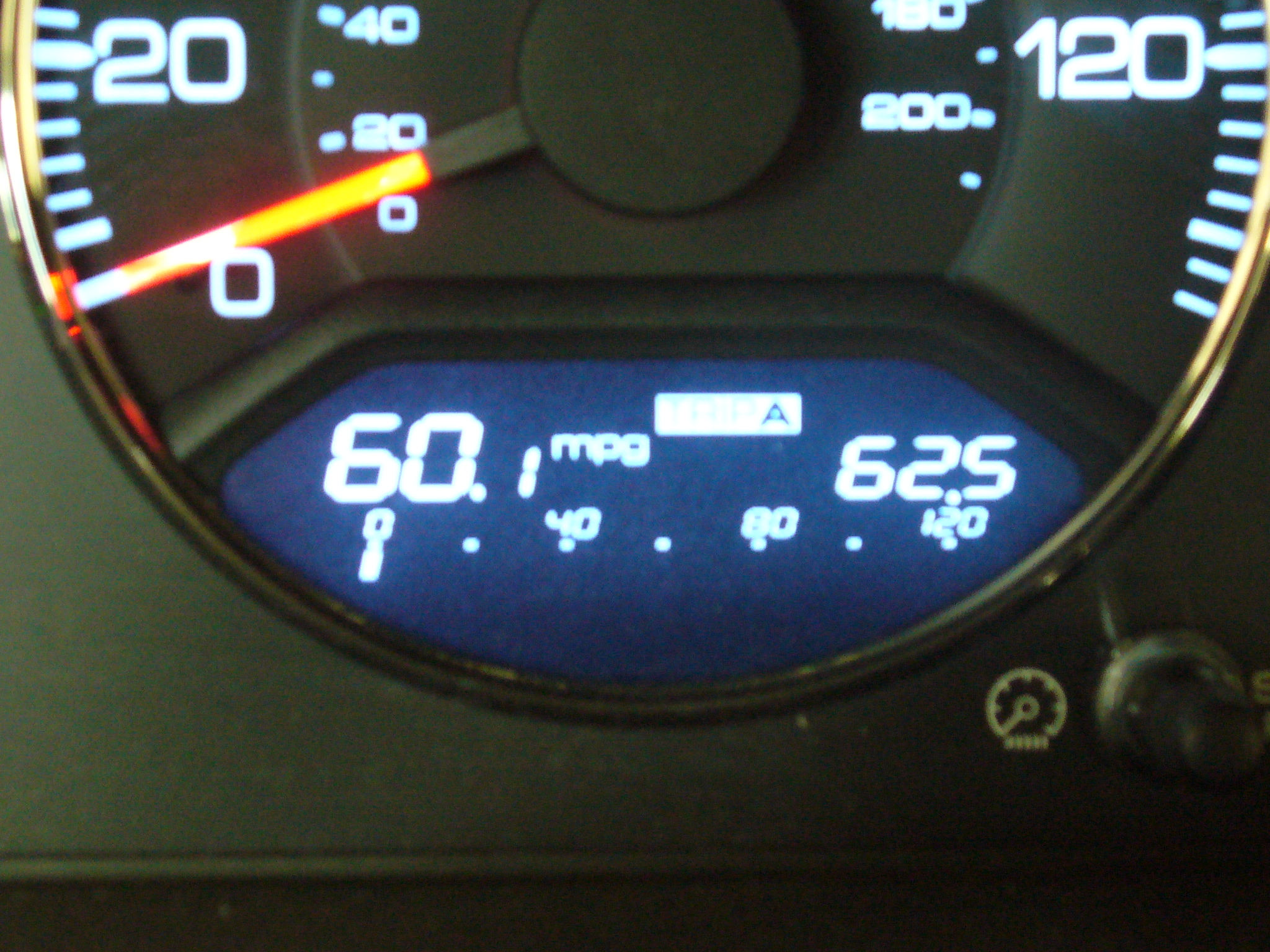 This was my mpg reading when I got home today – I averaged 60.1 mpg over the 62.5 round trip of my commute. A personal record, I think! (I drove carefully, caught most of the lights, didn't need to pull out fast into traffic, was able to drive with the windows up and no A/C, and it's a 5-speed - all good means of "hypermiling") It's too bad all cars don't come with an mpg gauge such as this one, where it displays a bar (at the bottom of the screen there) at all times showing you your mpg as it varies in real time - you can really see which driving behaviors affect it the most, and then it's like a game to beat your previous record on that same course.