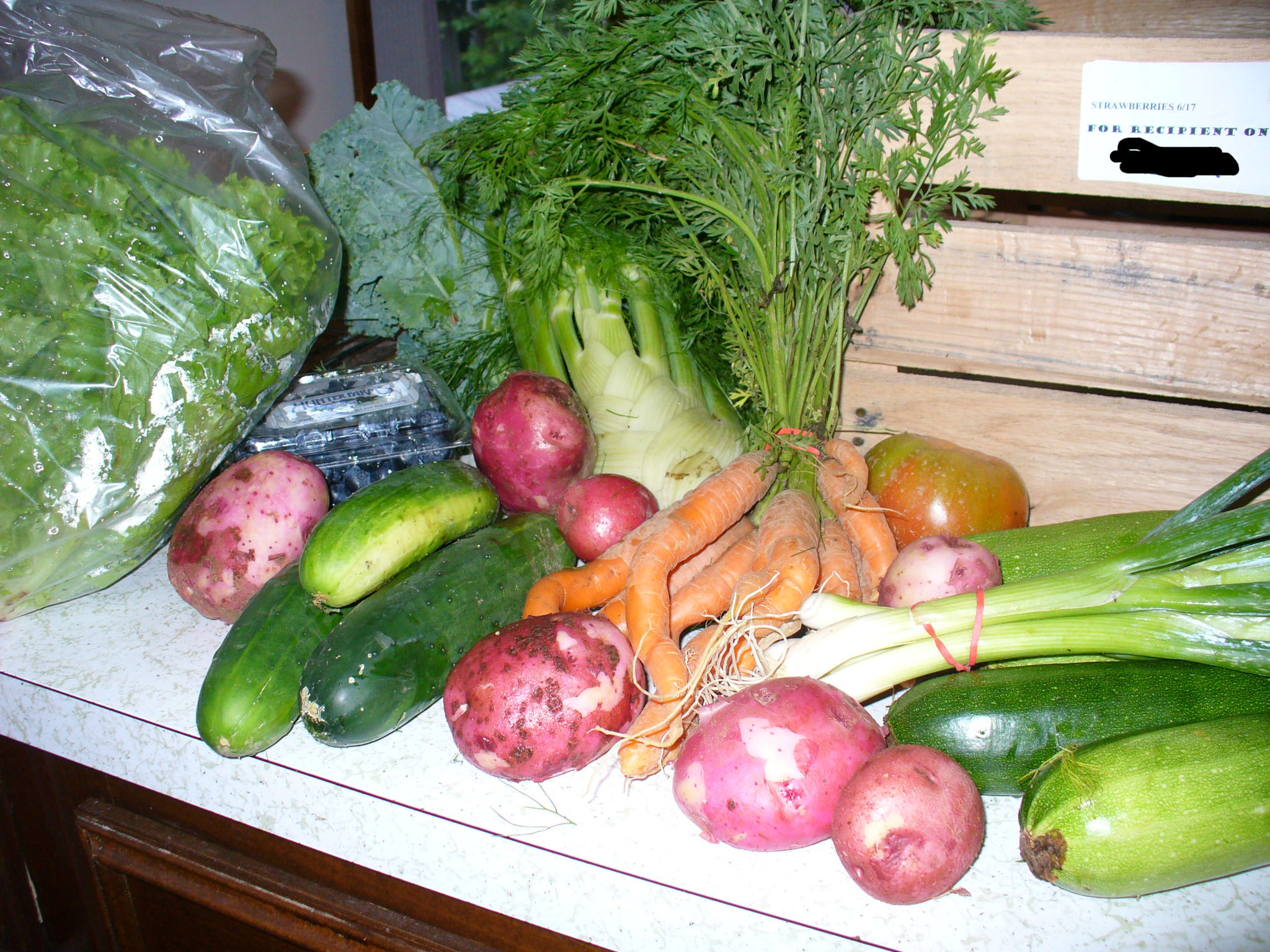 This week: more… lettuce (though a different type), fennel, new potatoes, zucchini, cukes, green onions. New this week: baby carrots, a lone tomato, dill, and a box of blueberries from a nearby organic farm.