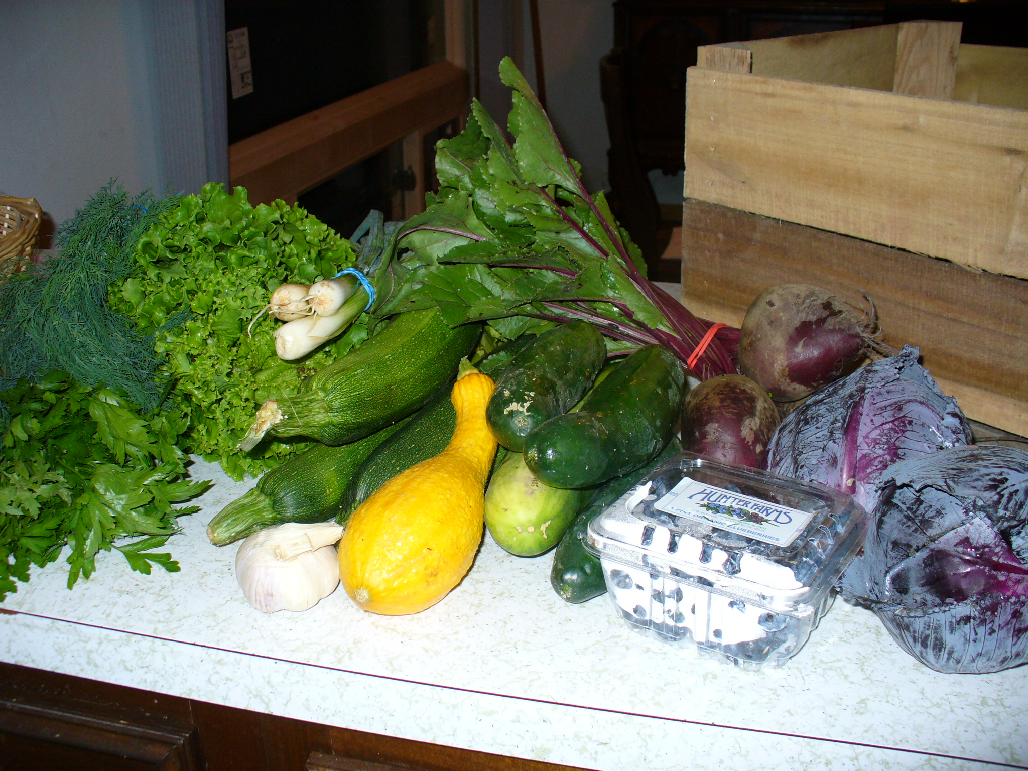 Some variety of beautifully curly leaf lettuce, flat-leaf parsley this time, two bunches of dill, a huge head of garlic (which we need like a hole in the head – we have hundreds of plants), a nice bunch of big green onions, more zucchini (getting bigger – these ones will be more suitable for zucchini pancakes or zucchini bread, rather than in salads like the little ones), more cukes (I had opted for an extra box of pickling cukes, which I think may be why they included extra dill and garlic, but I couldn't spot the box in the barn, so I'll have to ask about that), more (bigger) beets with lovely greens, another pint of blueberries, and new this week… yellow squash and purple cabbages. Also they threw in a box of windfall apples, but I left them out in the garage – they had a lot of fruit flies already, and they'll need some major paring of bad spots, but then they'll make good apple crumble, or I might dry some for apple chips.