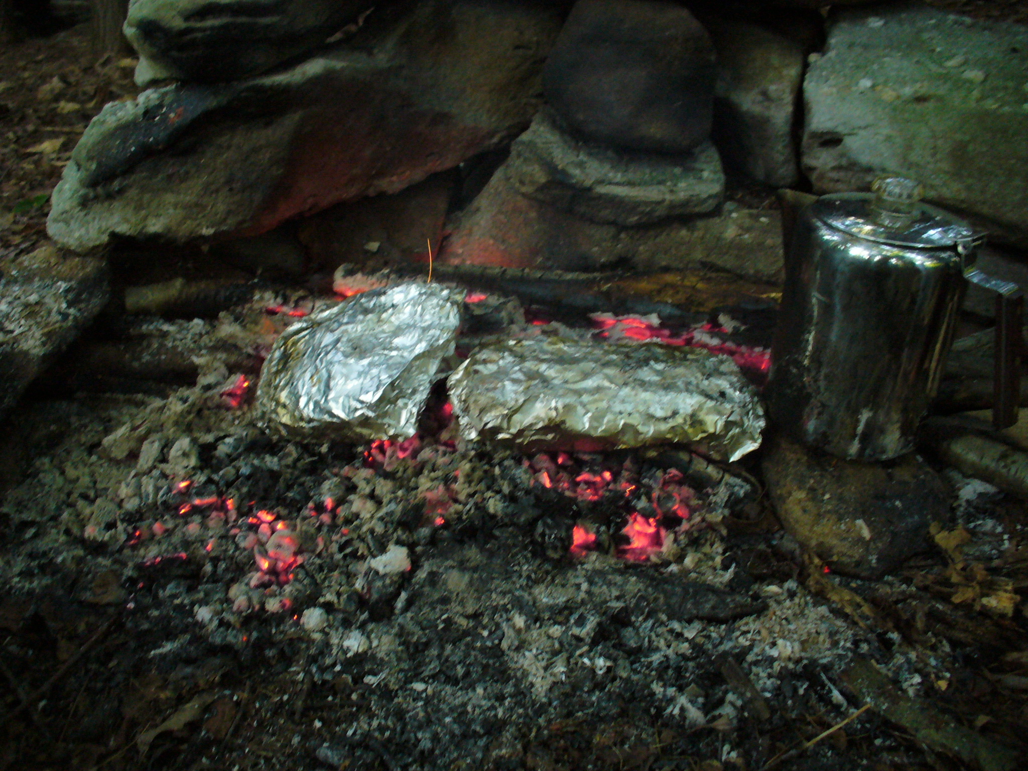 D&J had to hike back out after breakfast on Sunday, because D was scheduled to present a blacksmithing/storytelling program at the Woodhick festival, which we hiked out for too in the afternoon. Then we hiked back in to camp and cooked pasta sauce with tomatoes, green peppers, onions, and basil. It was a little tricky only having one pot… we cooked the sauce first till it cooked down, and then poured it into the Ziploc bag the veggies were in. Then we boiled the water for the spaghetti in the same pot. By that time D&J were back from the festival, so they helped with the pasta-cooking operation.
