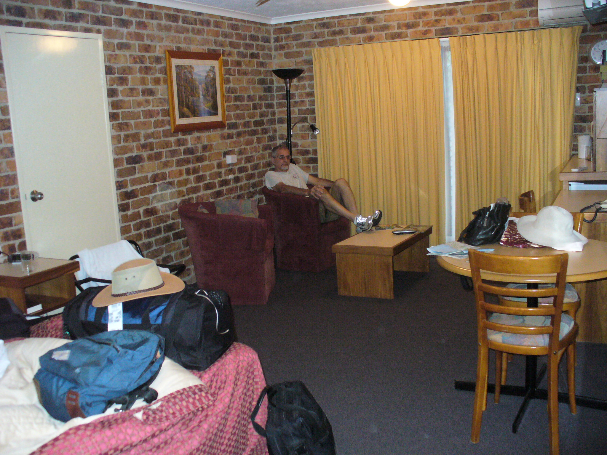 Our home for the two nights in Brisbane was the Toowong Villas complex in the Toowong (te-WONG) neighborhood. We had a studio apartment with one bed (since Alex was still at his own apartment), which was on a lower level, but with a little private walled patio out back. The room had a nice seating area, table, desk, little fridge, electric kettle, microwave, dishes. Wireless internet was available for $14/hour, so I bought an hour in order to check email and be able to look up ferry routes, restaurants, etc. No breakfast was included, but there was covered parking, a plus in the hot Brisbane summer. A nice-looking pool was nestled in the lush gardens, but we were too busy seeing the sights to use it. All in all, it was a decent place, and a pretty good value at A$115/night, though the walls were kind of thin between apartments.