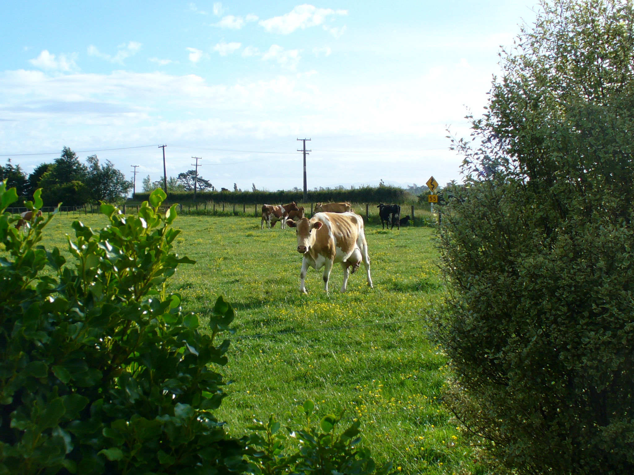 Our lodgings in the Matamata area Tuesday night were a "farmstay" near Wairere Falls. Of all the places I had found online for our trip, I was the most unsure about this one, based on its little webpage and its price ($80 NZ + $20 for 1 extra person, so that was only about $55 US). So our expectations weren't very high when we drove up to the little house in the farmland; our hosts were cutting grass out front, and I thought the house was theirs and our cottage was somewhere in the back 40, but it turned out that the whole house was ours for the night; the hosts' home was next door. We were pleasantly surprised as our hostess took us for a little tour of the house… 3 bedrooms, a full bath, a spacious living room with a wood-burning stove, a farm-sized kitchen with a sunny dining area, front porch, carport, and this view out the back window: