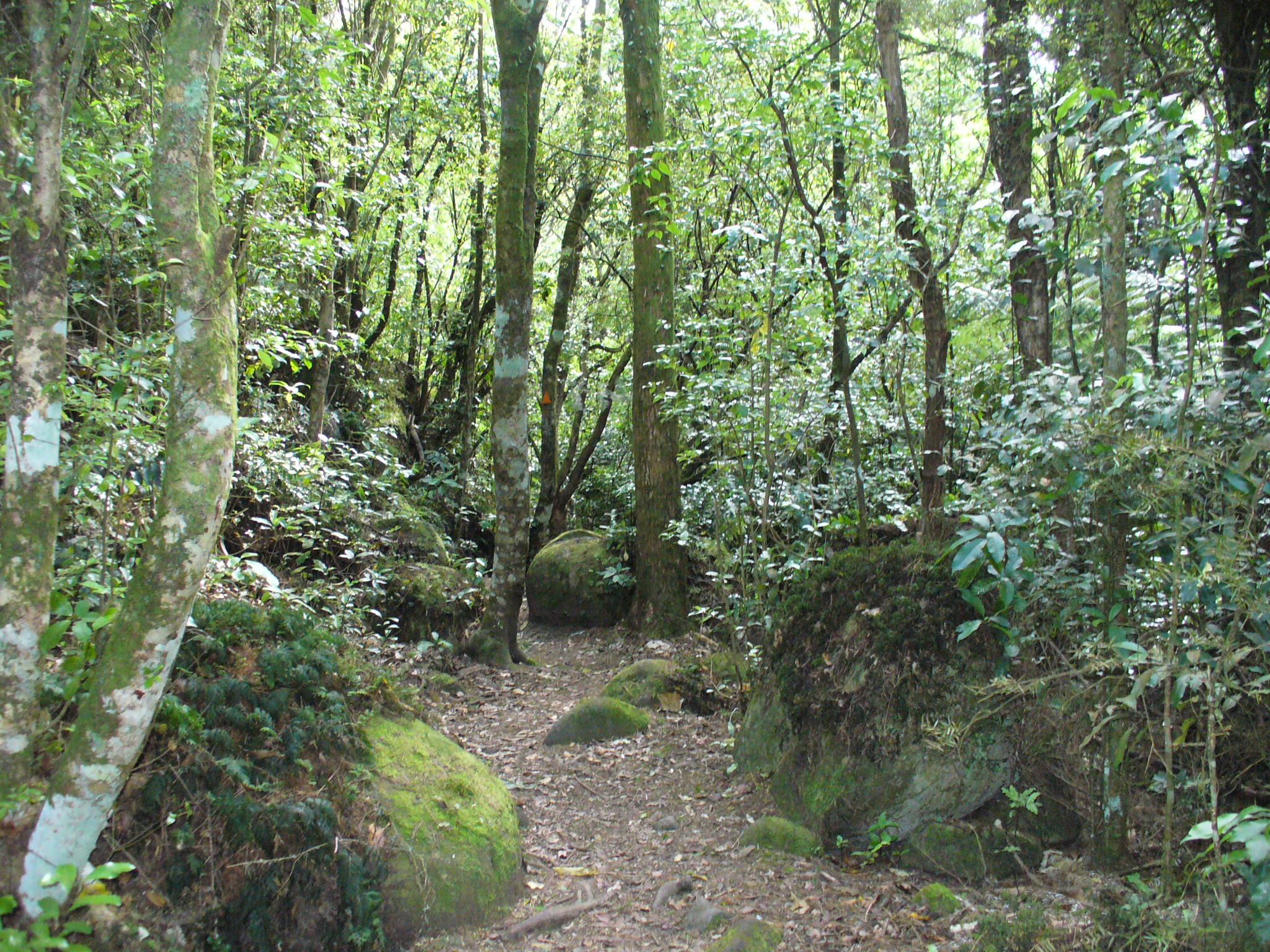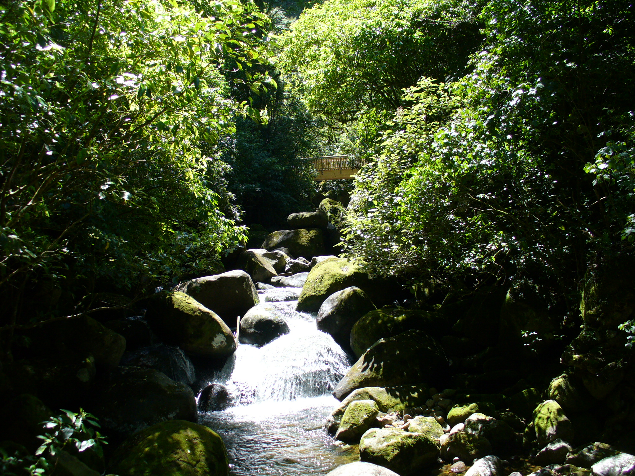 A little further on we came to the first of the bridges that were being reconstructed, and unfortunately it was then late morning so the workers were there. The bridge appeared to be pretty much ready for traffic, they were just putting some final touches on it, so we said what a nice job they were doing and what a lovely track it was, and may we please cross? The worker said “Well, it’s a little late now” (meaning we’d come down the trail about 45 minutes already), and he let us pass. Further yet, we came to another bridge receiving some final work, and we tried the same tack, but this time the worker said it was OK with him, but we’d have to ask the “boss”, who met Al in the middle of the bridge and blocked his way. After some discussion, he grudgingly let us pass, but really if we hadn’t been allowed to cross, it would’ve been a fairly easy matter to cross the stream on the big rocks. We were trying hard not to be jerky American tourists, but we did feel that it was no different from taking our own route through the bush, which wasn’t prohibited.
