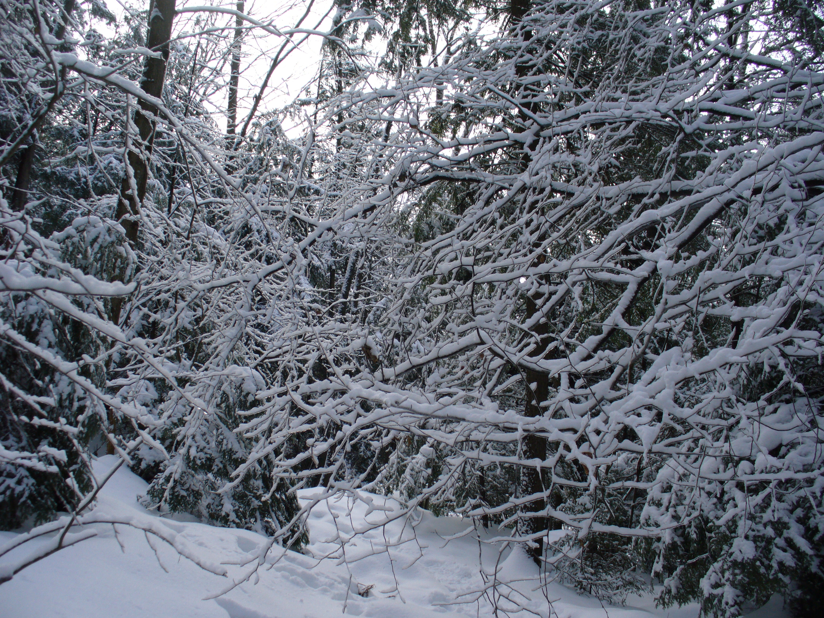 I would say there's at least a foot of snow in the undisturbed places. We tried to see how carefully we could walk and stay on top of the icy layer that was about 3" down, but I could only get a few steps before breaking through into snow almost to my knees. In a lot of places the snow was still sticking to every tiny branch, thanks to the freezing rain from Wednesday.
