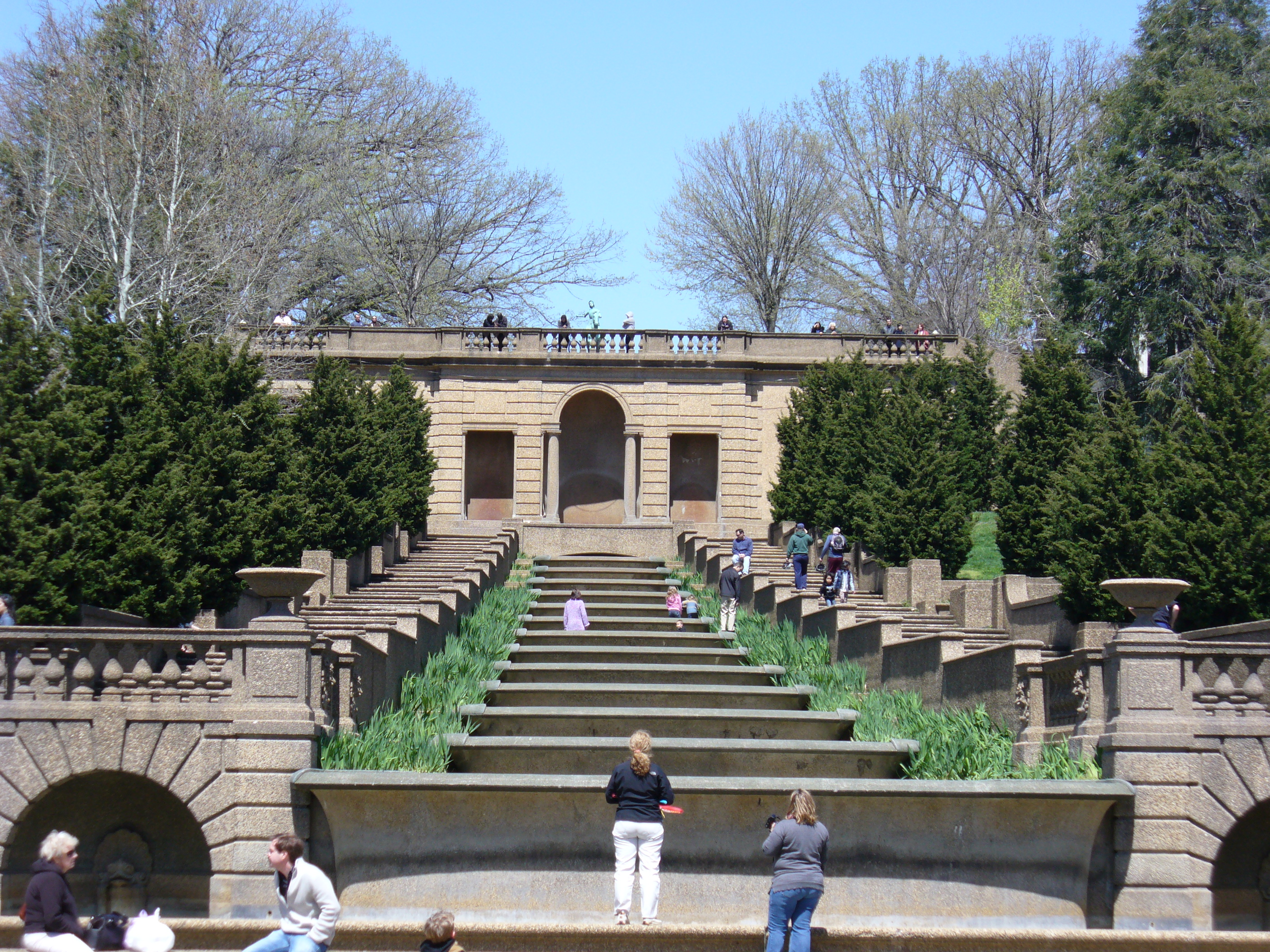 After lunch, we took Alex back to his place so he could work on his speech for class Monday night, and we went back to the B&B. Then we decided to take a little walk before it was time for church; we just looked on the map near our B&B, and found a little park about 7 blocks away, called Meridian Hill Park. It turned out to be a pretty interesting little city park, with lots of exposed aggregate balustrades and obelisks, a bronze statue of James Buchanan, and a very cool cascading fountain down the steep hillside (though the water wasn't running yet for the season. so people were climbing on it). There was a historical marker nearby that explained that 18th St got so steep in this area that the original DC city plan stopped here because horse-drawn carriages couldn't make the grade.