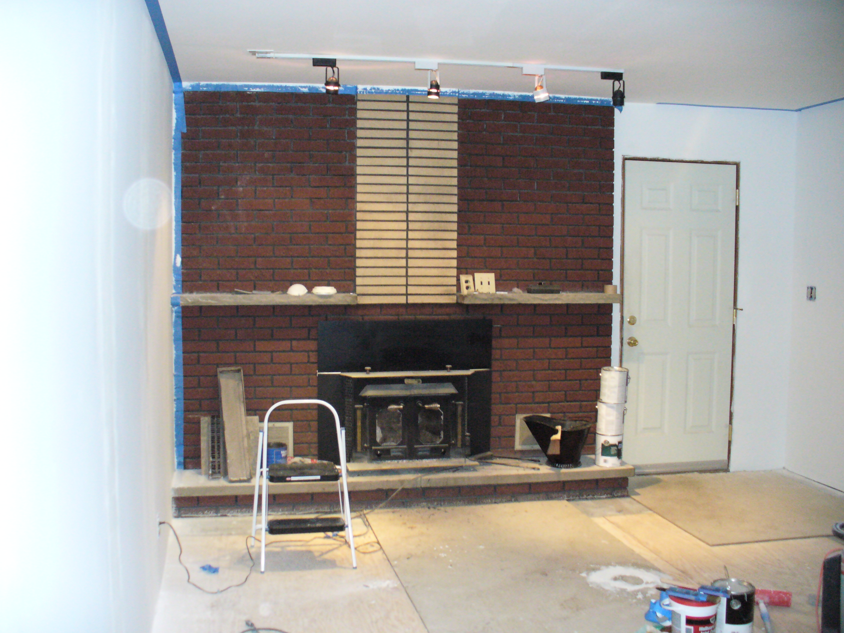 Last August after Nikki moved out, we decided to use her bedroom as a temporary TV room so that we could remodel the den downstairs. It hadn't been changed in the 20 years we've been here, and likely not in the 40 years of the house's existence. The carpet was a deep pile dark red, which over the years of living in a damp climate and having a dog, was pretty gross, no matter what we tried to do with it. The walls were paneled in a dark wood, which while it was a good quality paneling, real wood, just made the whole room so dark. There was a tiled area in front of the fireplace and garage door which was made of small dark green tiles that were beginning to come up in spots. The ceiling was still yellowed from the previous owners who had smoked. A lot. We had made a couple changes over the years… removed the teardrop 60's light fixture in the corner and replaced it with track lights over the fireplace … installed a wood-burning fireplace insert that actually heats the house … replaced the sliding glass door to the back patio with a french door opening onto an enclosed 3-season room (and removing the dark ornate tapestry-style drapes). But we decided it was now time for some real freshening up!
