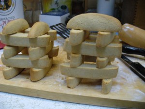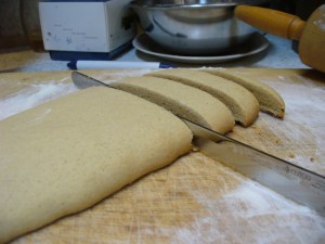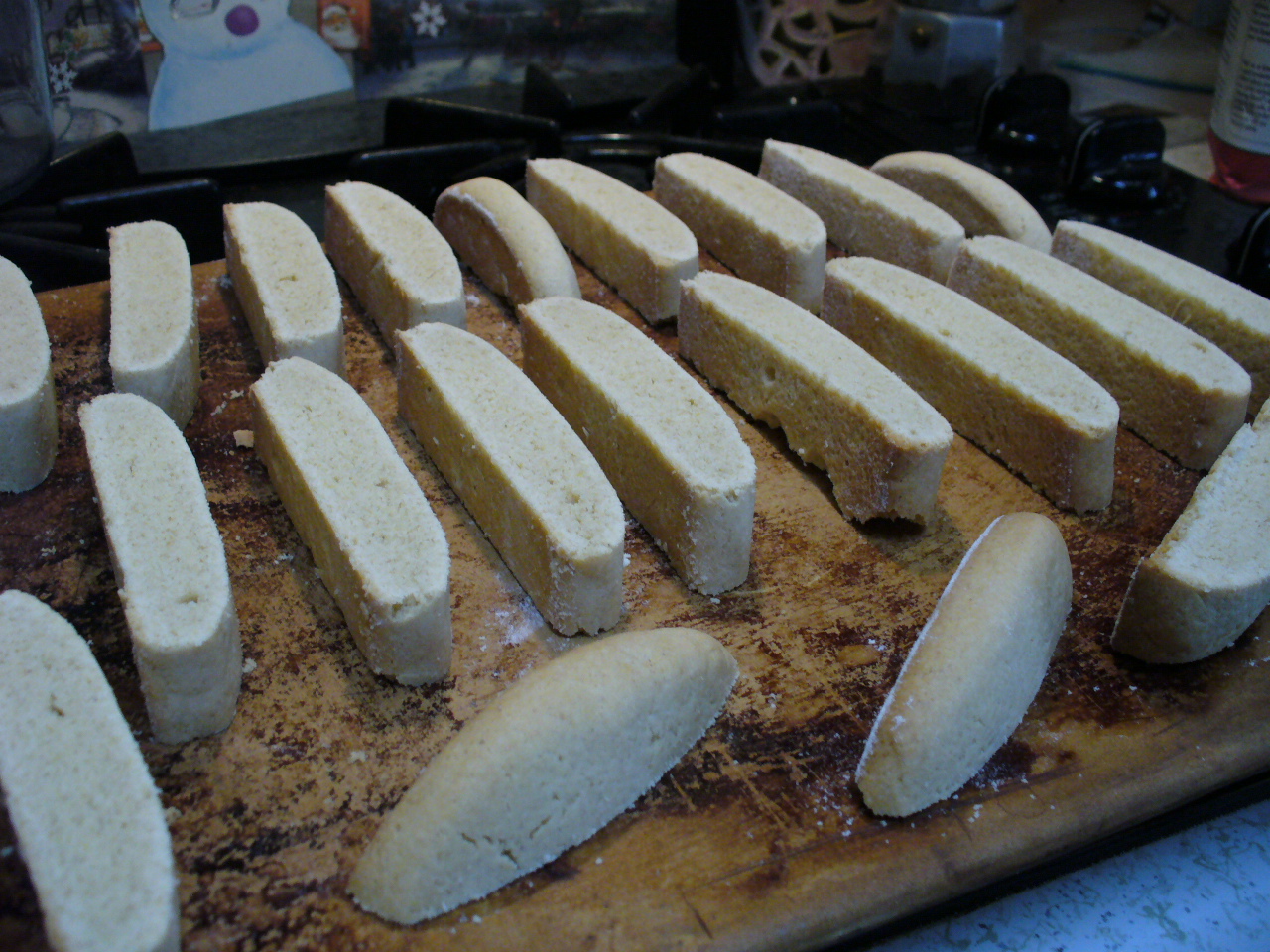 Place slices cut side down back onto the baking sheet or stone. Bake another 15 minutes. This second baking is what makes it biscotti 🙂