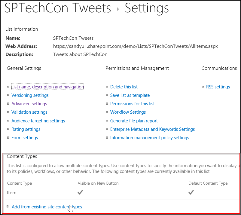 To enable the custom Tweet content type on this list, go to List Settings (which is now available via the gear icon in the upper right of your SharePoint page), click on Advanced Settings, and set Allow management of content types to Yes. You’ll now see a Content Types section on the List Settings page, and you can click on Add from existing site content types to enable the Tweet content type on this list.