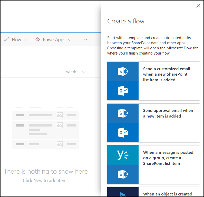 This will bring up a list of templates to choose from which are related to SharePoint lists, since that’s where we’re creating the Flow. Note, though, that Flows are related to the user account which is creating them, not to the SharePoint list they’re created from. That means that another user viewing this SharePoint list won’t see this Flow if they click See your flows in the dropdown. [As of Winter 2017, you can invite another user.]