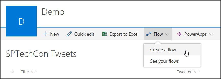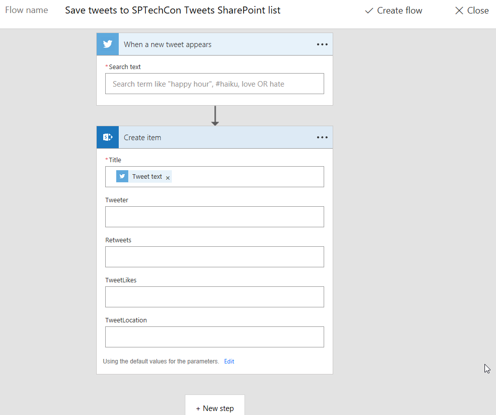 As part of my “Power to the People” session (presented at SharePoint Saturday Pittsburgh, several events in South Africa, and SPS Caribbean), I demonstrate a Flow which creates an item in a SharePoint custom list when there’s a tweet containing a particular hashtag (for example, a tweet about the event at which I’m speaking). This is one of the existing Flow templates, so it’s pretty simple to implement, but I’ve done some additional work around the Flow to make it more useful.