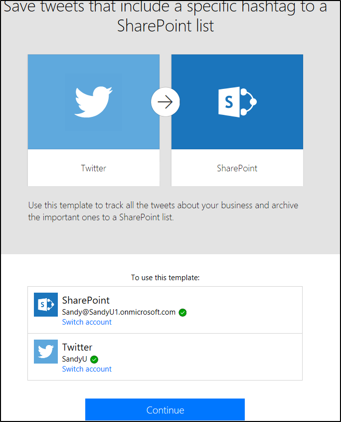 Clicking on the template tile opens the flow.microsoft.com site in a new browser tab, where you will need to set credentials for your Twitter account and for SharePoint Online if they aren’t already set as Connections in Flow/PowerApps. Then click Continue.