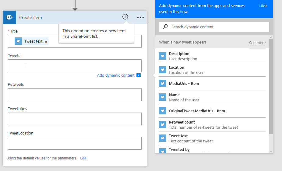 Next, we need to configure the Create Item action (the second box in the diagram). This is a very basic Flow, so all we want to do when a triggering tweet occurs is to create a new item in the SharePoint custom list we created earlier – we aren’t going to set any conditions or looping. Note that there are text boxes available for each of the custom columns in the SharePoint list from which we created the Flow. Flow has assumed we want the “Tweet text” to be the Title of our SharePoint list item, which is true, so we can leave that as is. When you move the cursor down to the Tweeter field, a dynamic content dialog will appear, listing each field available from the “When a new tweet appears” trigger, along with a brief description of what the field is. This is a great improvement over the experience prior to October 2016, where it displayed small inline buttons for each available field.