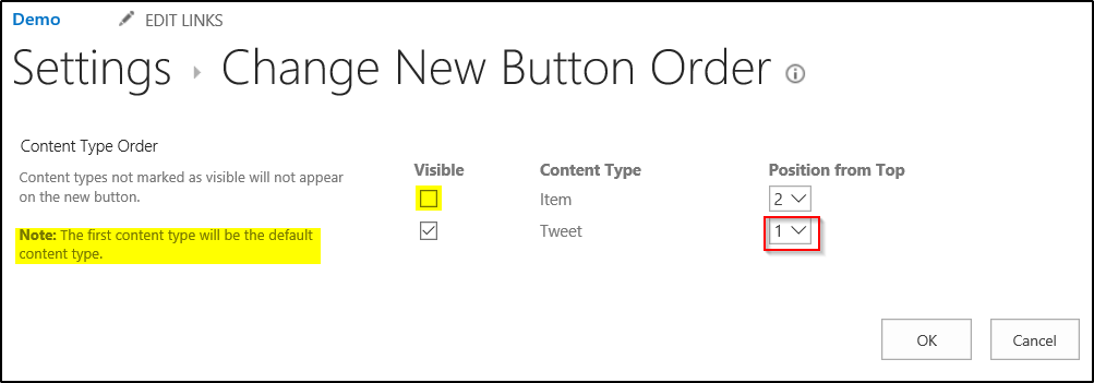 Back on the List Settings page, I can now see the Tweet content type listed below the default Item content type. I want all new items to use the Tweet content type, so I click Change new button order and default content type to set the default to Tweet instead of Item. To make a content type the default, change the Position from Top value to 1. And while I’m at it, I’m also going to hide the Item content type entirely by de-selecting the Visible checkbox for Item – although I don’t intend to make manual entries to this list, one never knows what someone else (including my future self) might come along and try to do…
