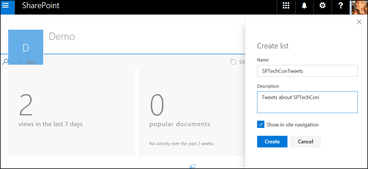 Next, I want to create a new Custom List which uses the Tweet content type… For this demo, I’ll record tweets using the #SPTechCon hashtag. Here, I’m creating my list on the Demo site (note that, as always, I create the list with no spaces in the name so the URL doesn’t contain %20, then I go to List Settings to add a space for readability):
