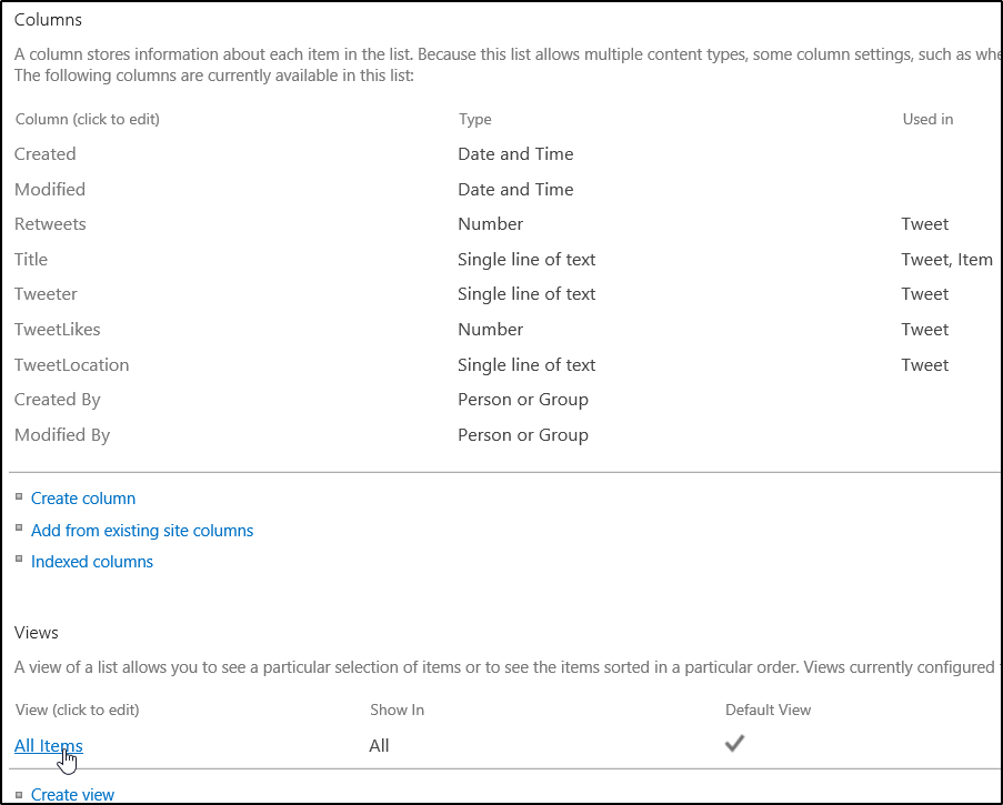 I’m also going to modify the All Items view to include those columns, so I can see them by default when I view this list. In addition, I’ve added the Created column to the default view, sorted in descending order, so the latest tweets will be at the top.