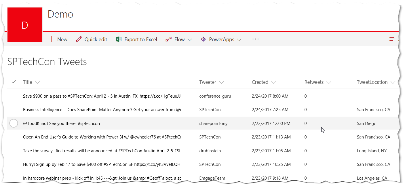 After saving the Flow, and allowing it to run for a while (assuming there are tweets occurring with the given hashtag), you can see the results in the SharePoint list: