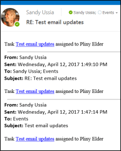 Note also that although my other two users had not subscribed to email updates, they both received email notifications of the additional assignments… My Gmail account received all 3 notifications, because Gmail. My O365 account received the 2nd and 3rd notifications, because they were additions to the Feed where I had made a previous entry (the initial assignment to Pliny). Note in my email screenshot below that the first notification was only to the Events Group, but the 2nd & 3rd notifications were to me and the Events Group.