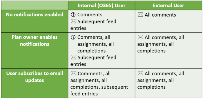 I’ve put together a summary chart, where the info icon indicates an Outlook Group notification, and the envelope icon indicates an email…