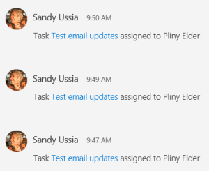 So I think all of the above is by design, rather than an issue (see this UserVoice entry from February about Comment notifications). However, I found an anomaly with additional Task assignments, which is a feature just added to Planner on April 1, 2017. I assigned a Task to Pliny, so he received an email as expected (after he subscribed to email updates). But when I also assigned the same Task to my Gmail user and then to my O365 user, the email notifications each said the Task was assigned to Pliny. This is because the entries in the Task Feed were all the same, presumably because Pliny was the initial assignment – but this needs to be fixed (I’ll be adding it to the Planner UserVoice).