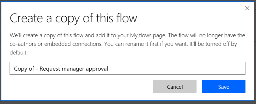 Note that the message that appears when you click “Save As” says that what this does is copy the Flow as a “My Flow”, without the co-authors (i.e. the “Team” with whom you had shared the Flow) or the connections the Flow used.