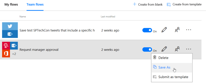 he Microsoft Flow team announced yesterday that the “Save As” feature is now available for Team Flows. It was previously only available for your own Flows.