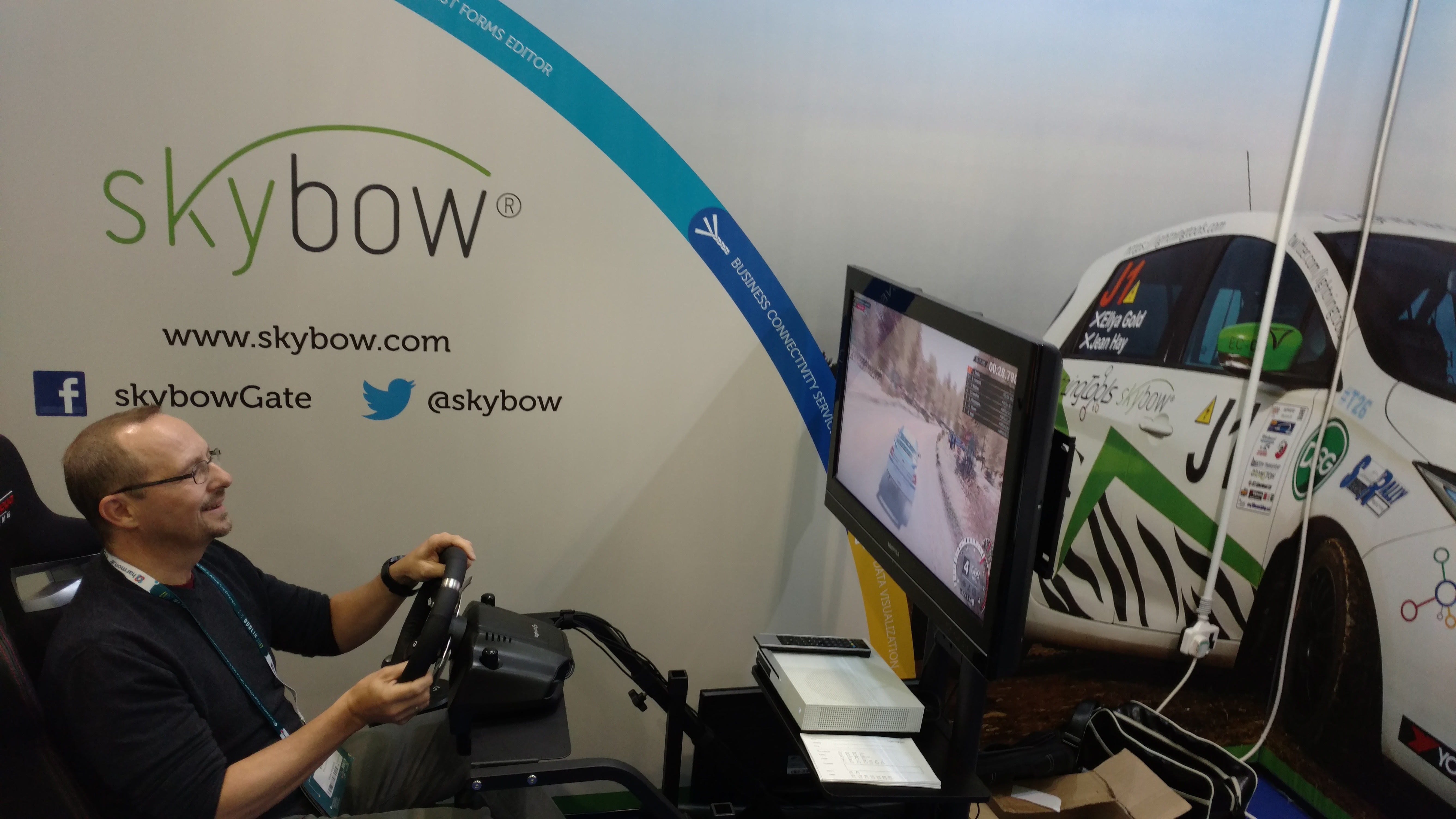 The racing game was great fun throughout the conference, with people returning again and again to see how they were doing on our top ten board. It was especially cool that the driver of the e-rally car which Lightning Tools sponsors was at the conference (because he’s a SharePoint guy), so he tried the sim as well (pictured here). We had announced that the leader at the end of the three days would take home the prize of a radio controlled Subaru Impreza. But when it came near the end on Thursday, we had 3 very close contenders, so we decided to have a race-off among the three, with a new track to race on. The race-off drew a crowd, and was quite exciting for everyone!