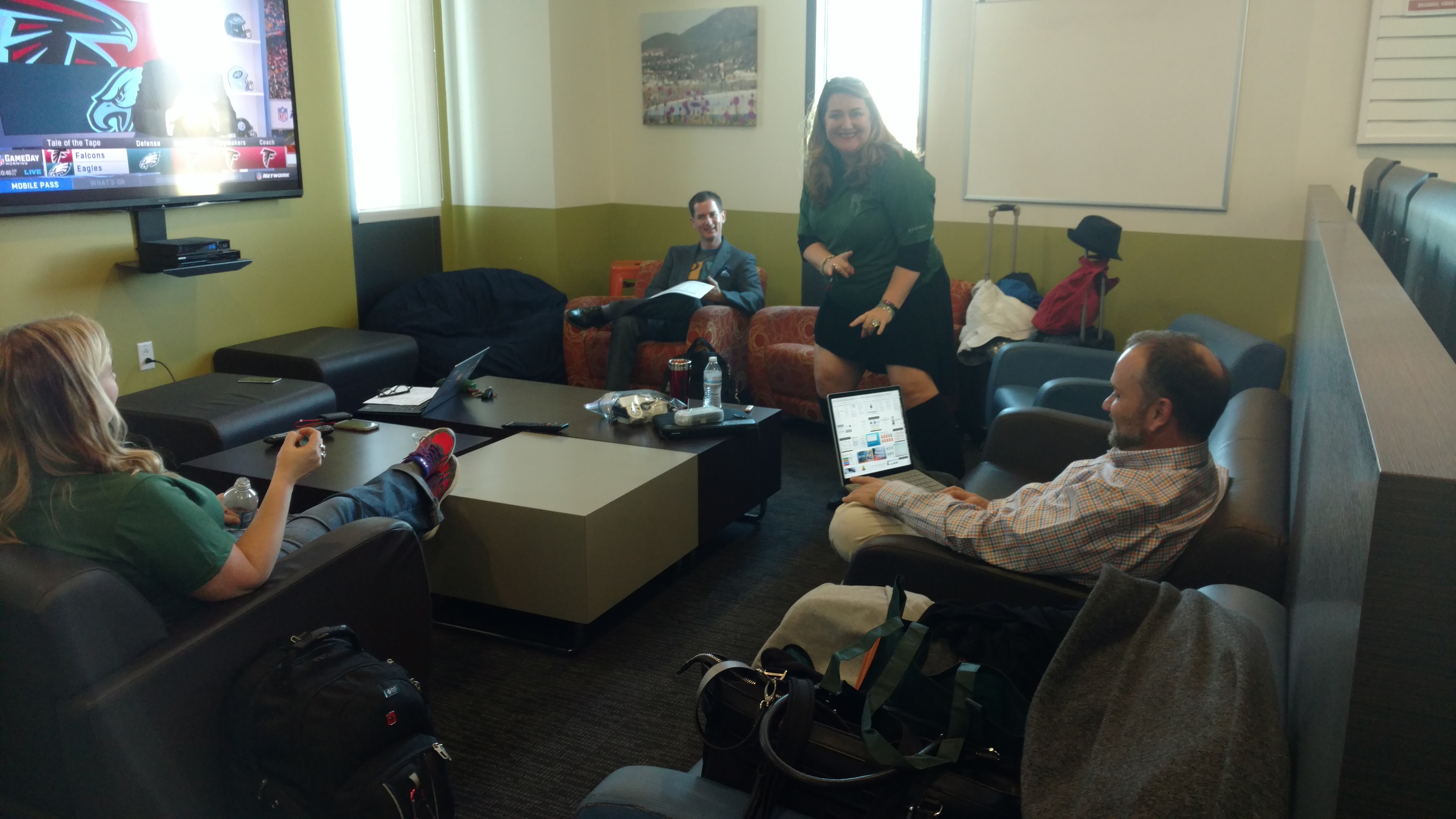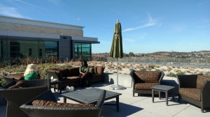 The speaker lounge was the best I’ve ever seen: it was a student lounge on the top floor, so it was fitted out with foosball, pool tables, video games, couches, and TVs. And! It extended onto a rooftop terrace with more couches and tables in the lovely 85-degree sun.