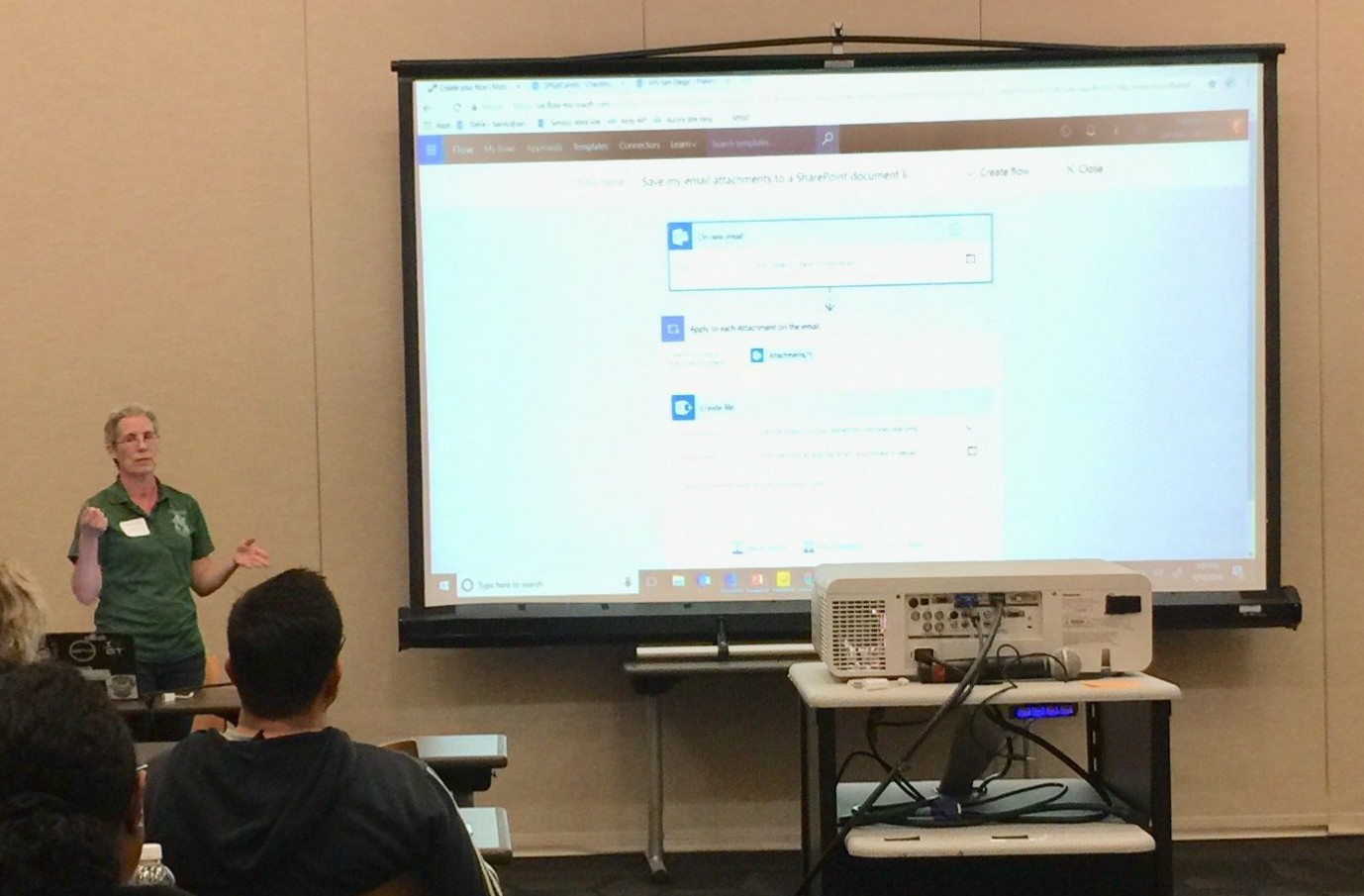 My session was the same one I’ve presented recently in Baltimore and Cambridge: an introduction to Microsoft Flow. But of course, each time there are lots of new features, so I always update my screenshots, and change out my demos to show off cool new things. This time, my demos were: